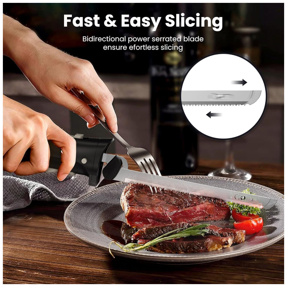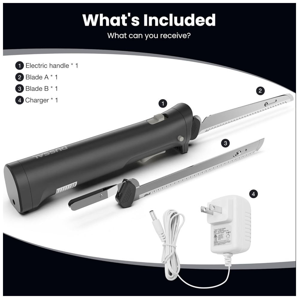 Com a Faca Elétrica Sem Fio DUSSAL, você se liberta completamente das tomadas e pode operar livremente em qualquer lugar da cozinha, sem precisar de um cabo de energia volumoso, melhorando a eficiência e o conforto. Alimentada por uma bateria de lítio embutida de 2000 mAh, pode ser totalmente carregada em apenas 2,5 horas e usada continuamente por até 70 minutos. Com design seguro e conveniente, possui trava de segurança inteligente que evita ativações acidentais, garantindo uso sem preocupações. A operação fácil e confortável é garantida pelo cabo ergonômico que oferece uma pegada confortável, minimizando a fadiga e permitindo cortes mais fáceis, rápidos e eficientes. Com um peso de apenas 573 gramas, essa faca elétrica pode ser operada sem esforço para qualquer tarefa de corte. As lâminas de aço inoxidável removíveis permitem uma limpeza fácil, com bordas serrilhadas para cortes limpos e fáceis. Além disso, as lâminas podem ser facilmente substituídas, tornando a manutenção simples. Versátil, este modelo acompanha duas lâminas que podem ser usadas separadamente para cortar uma variedade de alimentos como carnes, peru, pães e peixes.