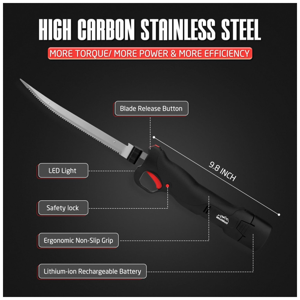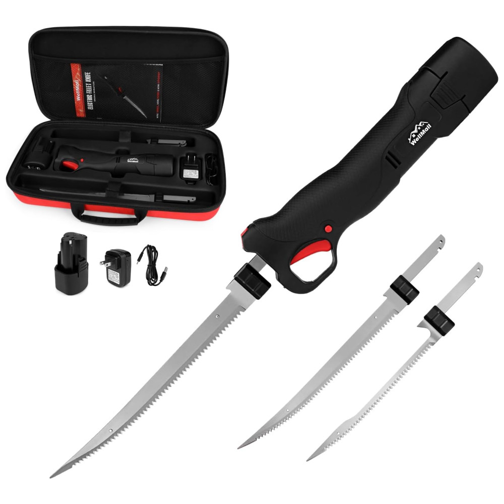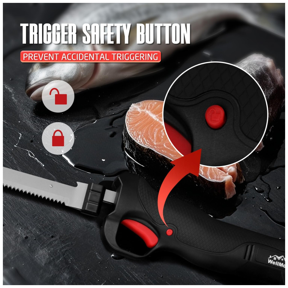 Faca Elétrica Sem Fio para Filé de Peixe com 2 Lâminas de Aço Inoxidável Cabo Antiderrapante e Travamento de SegurançaWellMall