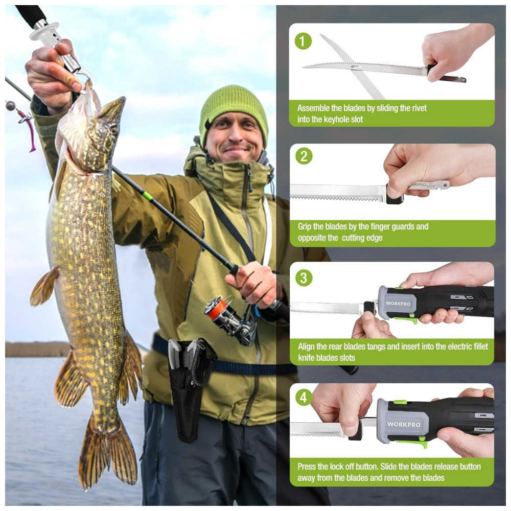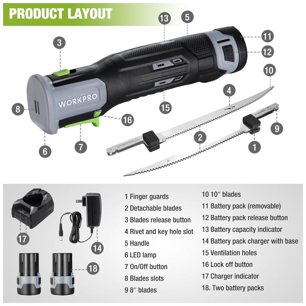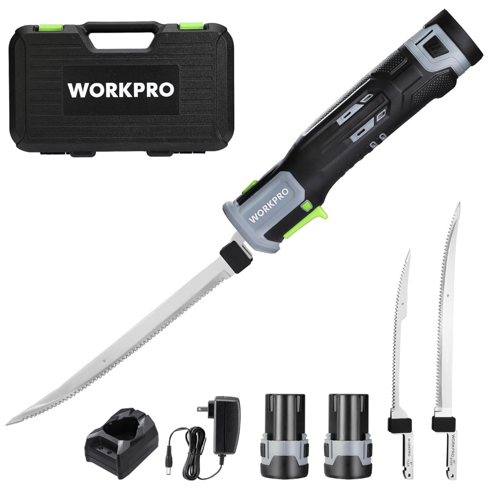 Faca Elétrica Sem Fio WORKPRO 12V para Filé de Peixes com Lâminas de 8 e 10 Polegadas Cabo com Empunhadura Antiderrapante e Trava de Segurança 2 Ba