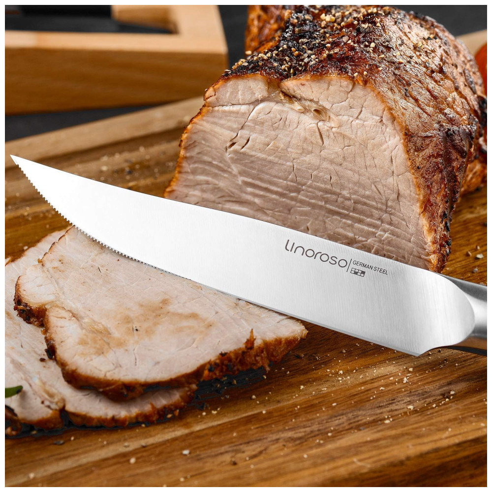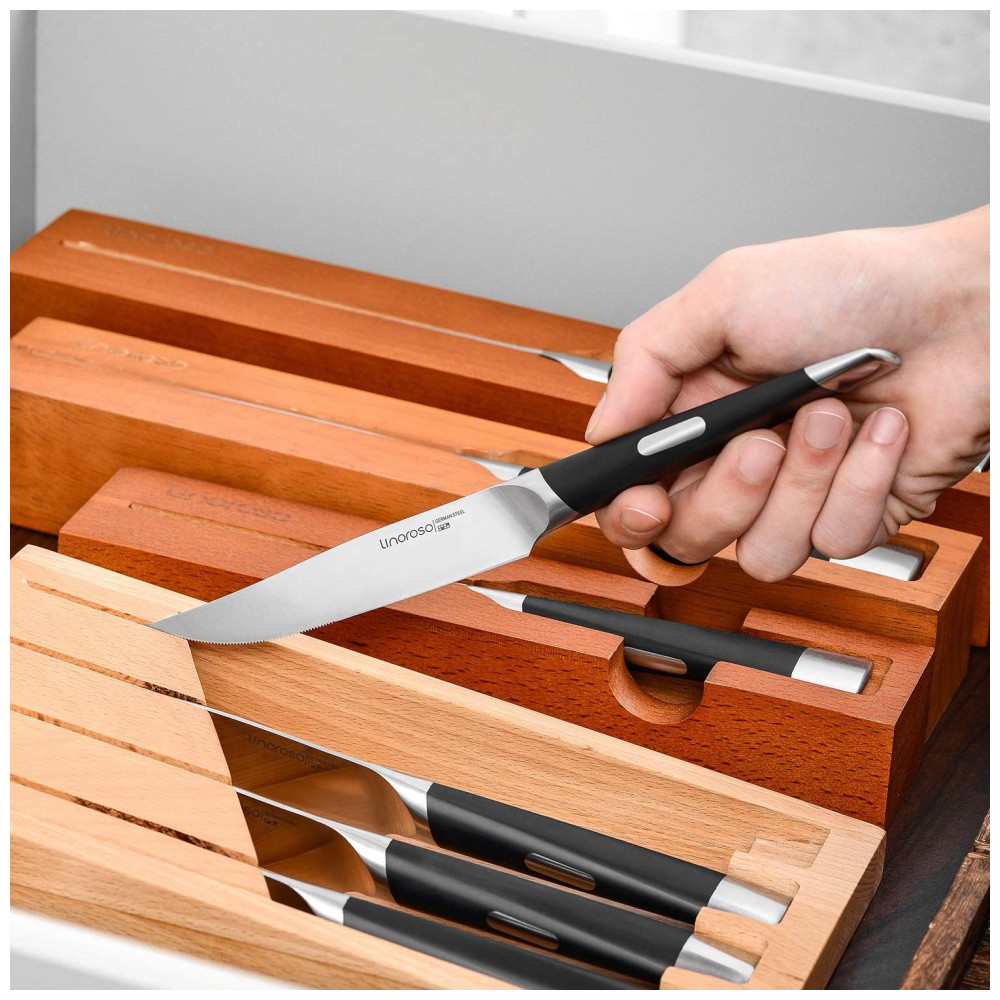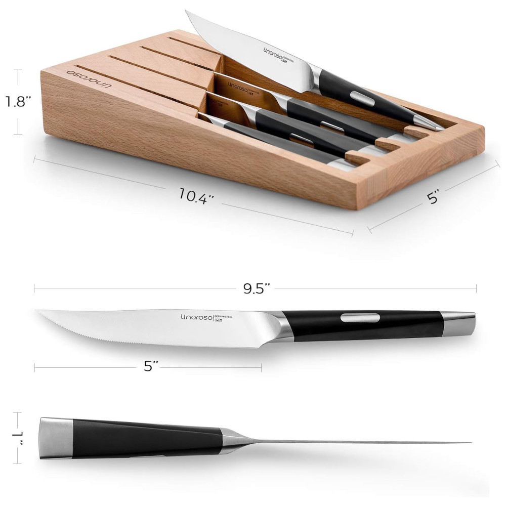 Faca para bife Linoroso . Conjunto de 4 facas. As facas para bife são usadas para cortar bifes e outros alimentos Bônus para blocos de zenamento de madeira de faia Cada compra vem com um bloco de madeira de faia requintado e personalizado para resolver problemas de zenamento. O bloco de faia pode caber facilmente em gavetas de cozinha padrão para manter sua gaveta fora de bagunça e pode ser colocado na bancada. Conjunto de Facas para Bife Faca de Mesa de 5 Pol. Talheres de Cozinha com Lâmina Semi Serrilhada 4 peças bloco de zenamento Faca para Bife Semi serrilhada
