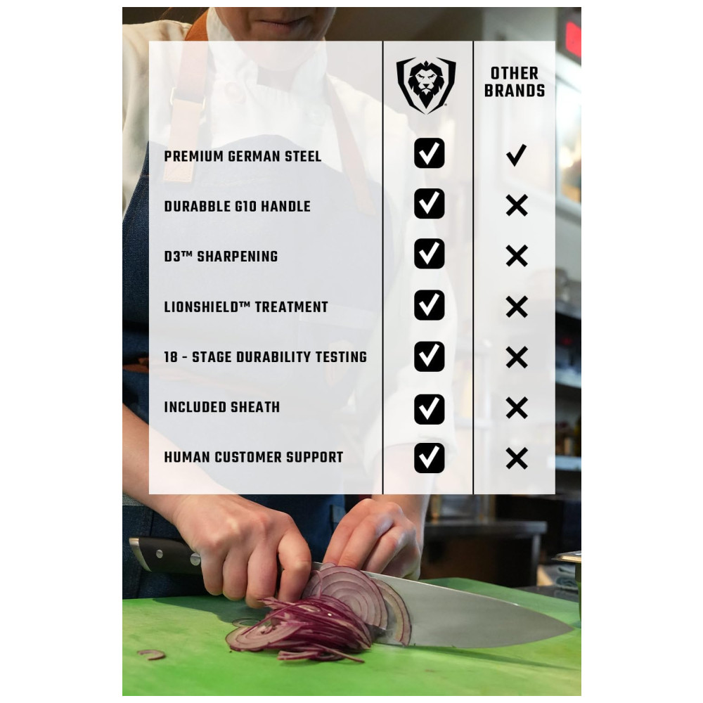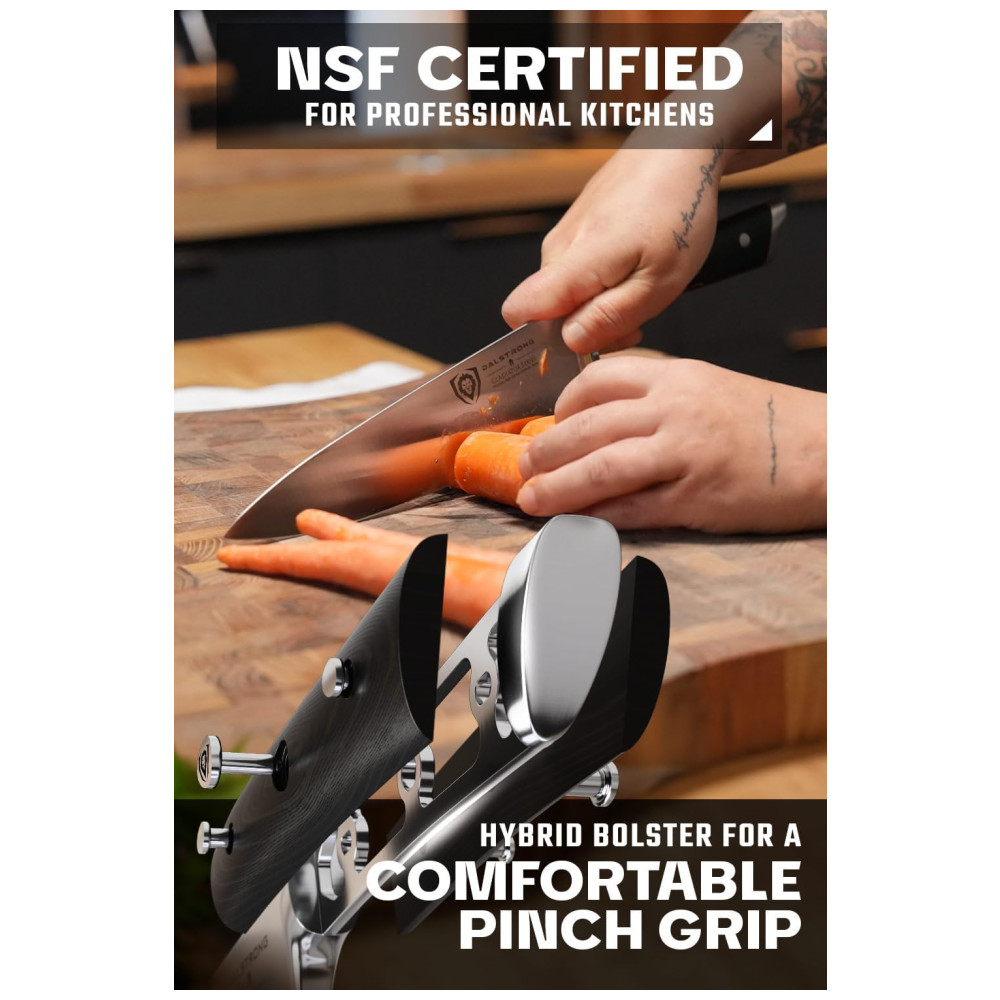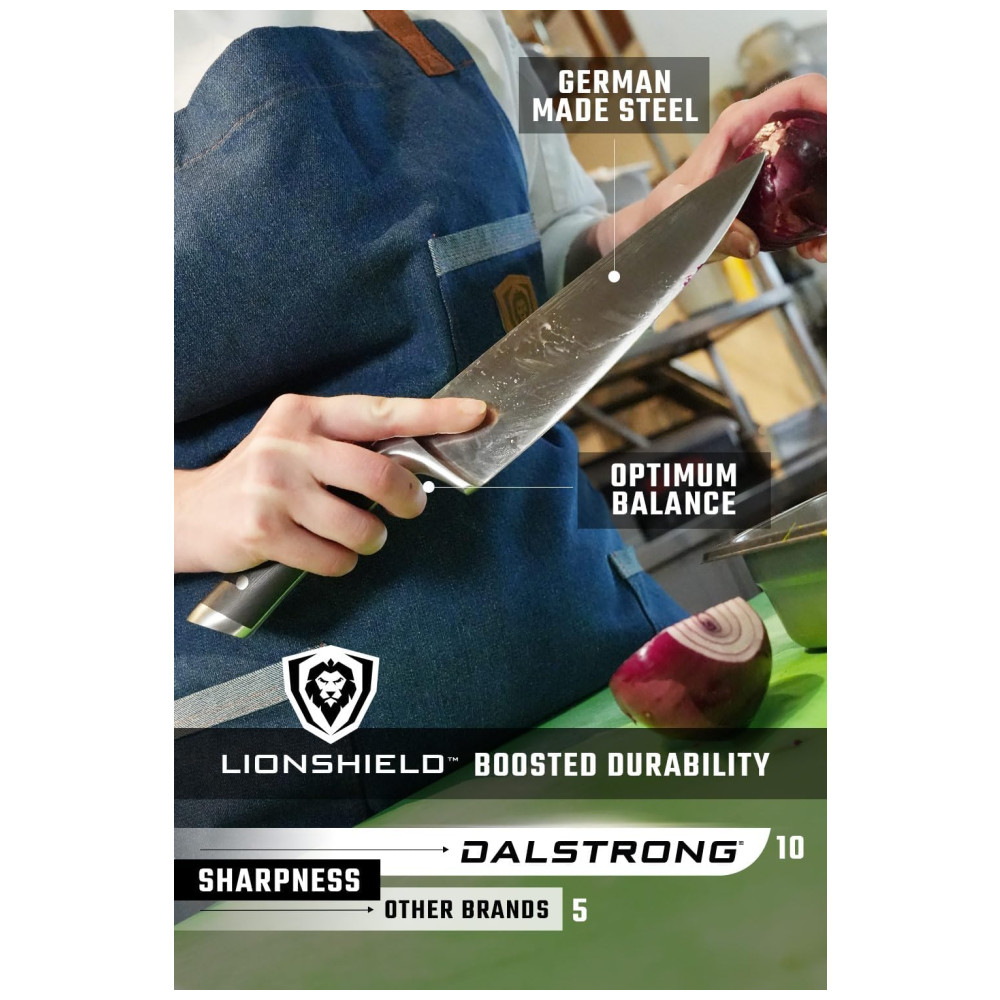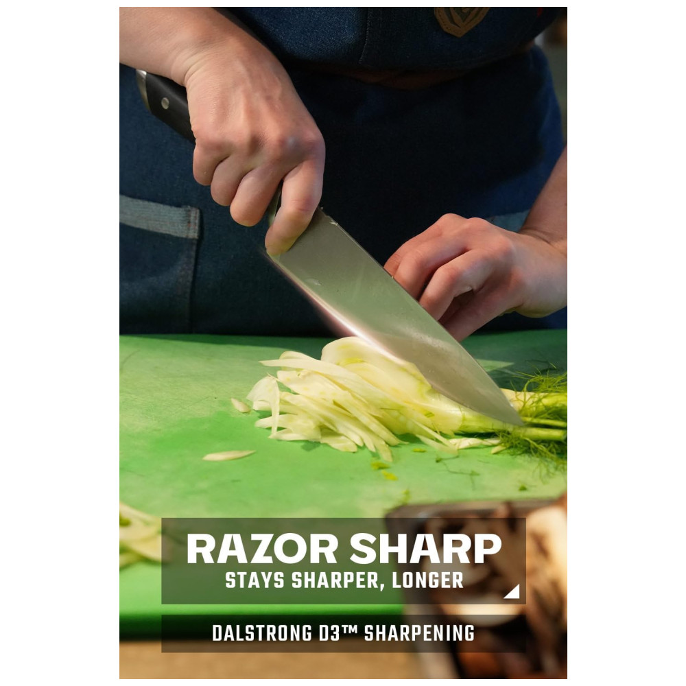 Excelente artesanato, tecnologia de ponta, elementos de design impressionantes e materiais premium. O desempenho máximo nunca foi tão bom a esse preço. Aço alemão de alto carbono importado, incrivelmente nítido e com nitidez nítida, com uma borda polida à mão de 14 a 16 graus por lado. Temperado com precisão e resistente a manchas. Design premiado, com peso satisfatório, materiais premium e sensação de qualidade. A alça de pakkawood preta importada de luxo tem três rebites com uma alça que garante conforto e manobrabilidade. Laminado e polido para uma construção sanitária, perfeito para cozinhas movimentadas Projetado com perfeição na dureza 56 Rockwell e polido à mão para um acabamento acetinado. Cuidadosamente afunilado para maior dureza, flexibilidade e resistência mínima ao corte. A altura alta da lâmina fornece uma folga útil da junta. Veja por que milhares de chefs profissionais e cozinheiros domésticos amam e confiam na DIFERENÇA DALSTRONG