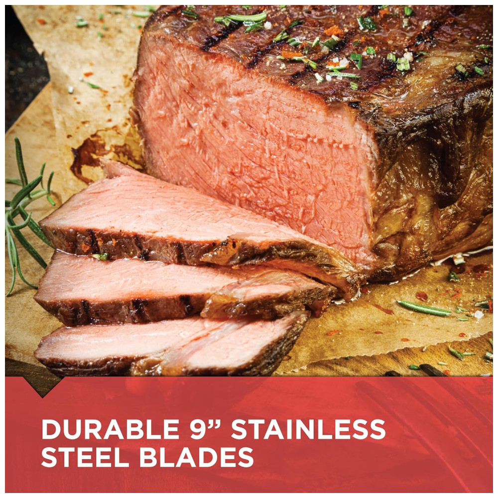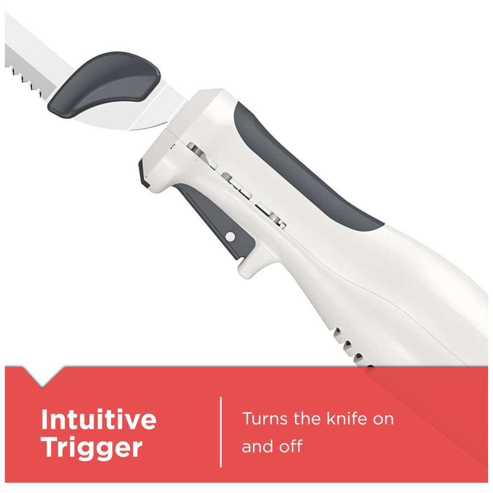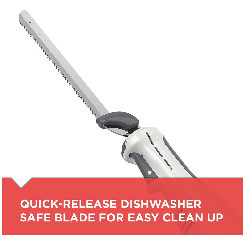 As lâminas serrilhadas de aço inoxidável cortam rapidamente e de forma uniforme carnes, pães, espumas e muito mais. Além disso, elas nunca precisam ser afiadas. O cabo com empunhadura ergonômica é projetado para aumentar o conforto e controle durante o corte. As peças removíveis podem ser lavadas na máquina de lavar louça para uma limpeza rápida e fácil. Tenha tranquilidade com o botão de bloqueio de segurança, que impede a faca de ligar quando está conectada. Um simples pressionar do botão de liberação de lâmina destrava as lâminas para remoção fácil e rápida.