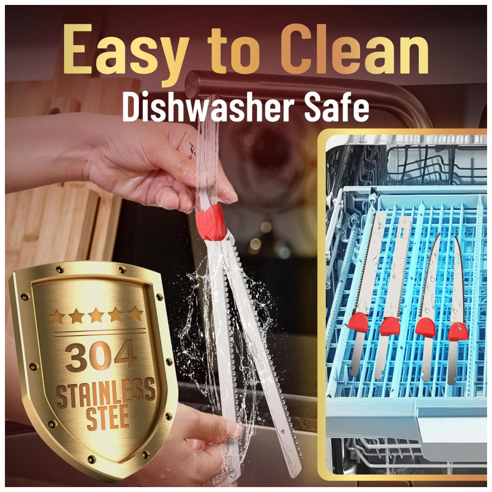 Característica Especial: Facas Elétricas Recarregáveis e Sem Fio para Cortar Carnes, Lâminas Serrilhadas e Controles Fáceis para Cortes Sem Esforço, Carregamento via USB, Cabo Ergonômico, Lâminas Laváveis na Lava-Louças, Possui Trava de Segurança, Inclui Termômetro de Alimentos, Pincel de Óleo, Luvas de Segurança, Garfo para Carne e Lâminas Especializadas em um Estojo Estiloso.,