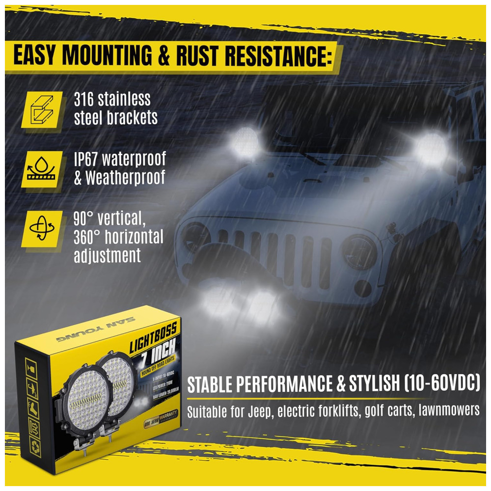 Luzes offroad de LED circulares LightBoss de 7 polegadas são projetadas para todos os veículos 12V , 24V , 36V , 48V , 60V. Eles são s como faróis , luzes de direção de caminhões on road , off road ou luzes de trabalho de tratores.
