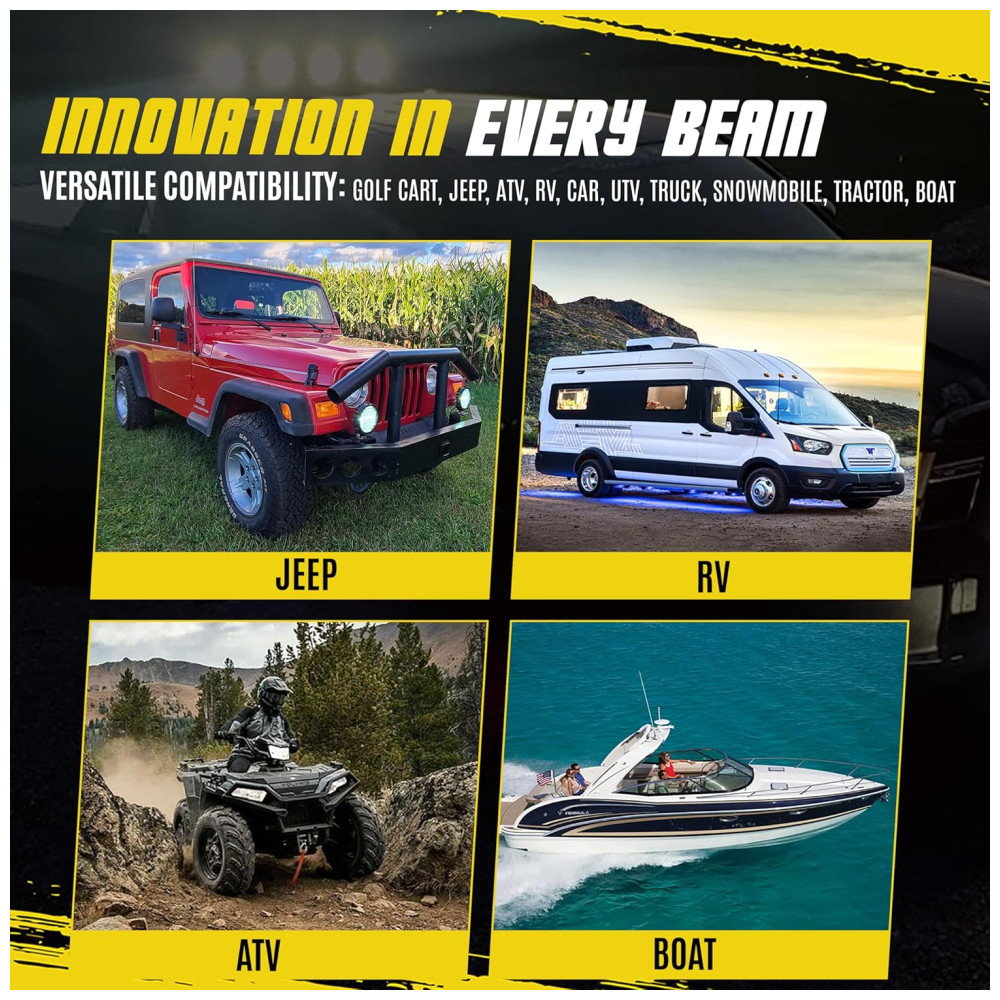 Funcionamento em todas as condições climáticas e à prova dágua A caixa de alumínio garante eliminação rápida do calor para lâmpadas LED. O projeto de vedação atualizado garante IP67 à prova dágua. Lente de PC de alta transparência e cabo de sílica gel garantem que as luzes do pod funcionem perfeitamente de 40 a 80 graus Celsius em automóveis, serviços pesados.