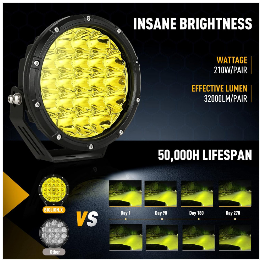 Farol de Milha LED Âmbar 210W 32000 Lúmens Off Road a Prova d Água IP69 para Carros e Picapes BIGLION.X