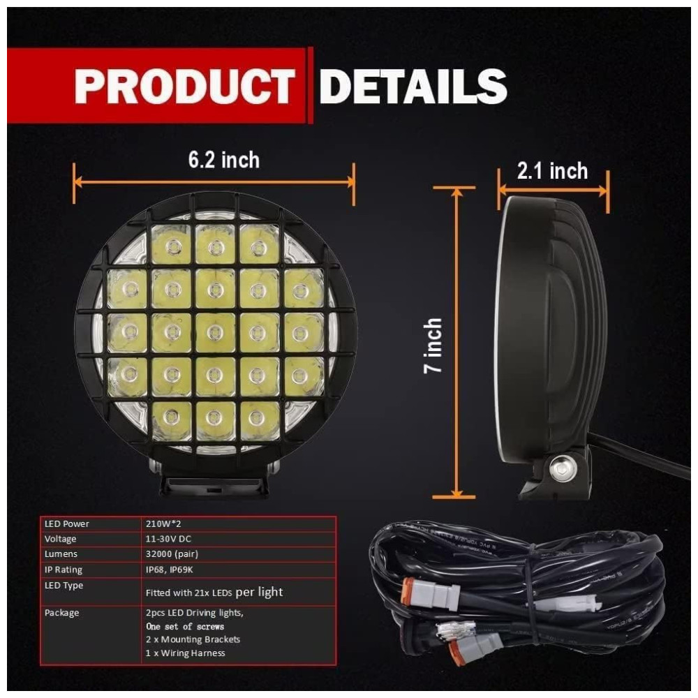Farol de Milha LED com 32000 Lúmens e Luz Branca IP68 12V 24V 210W 2Un BIGLION.X Preto