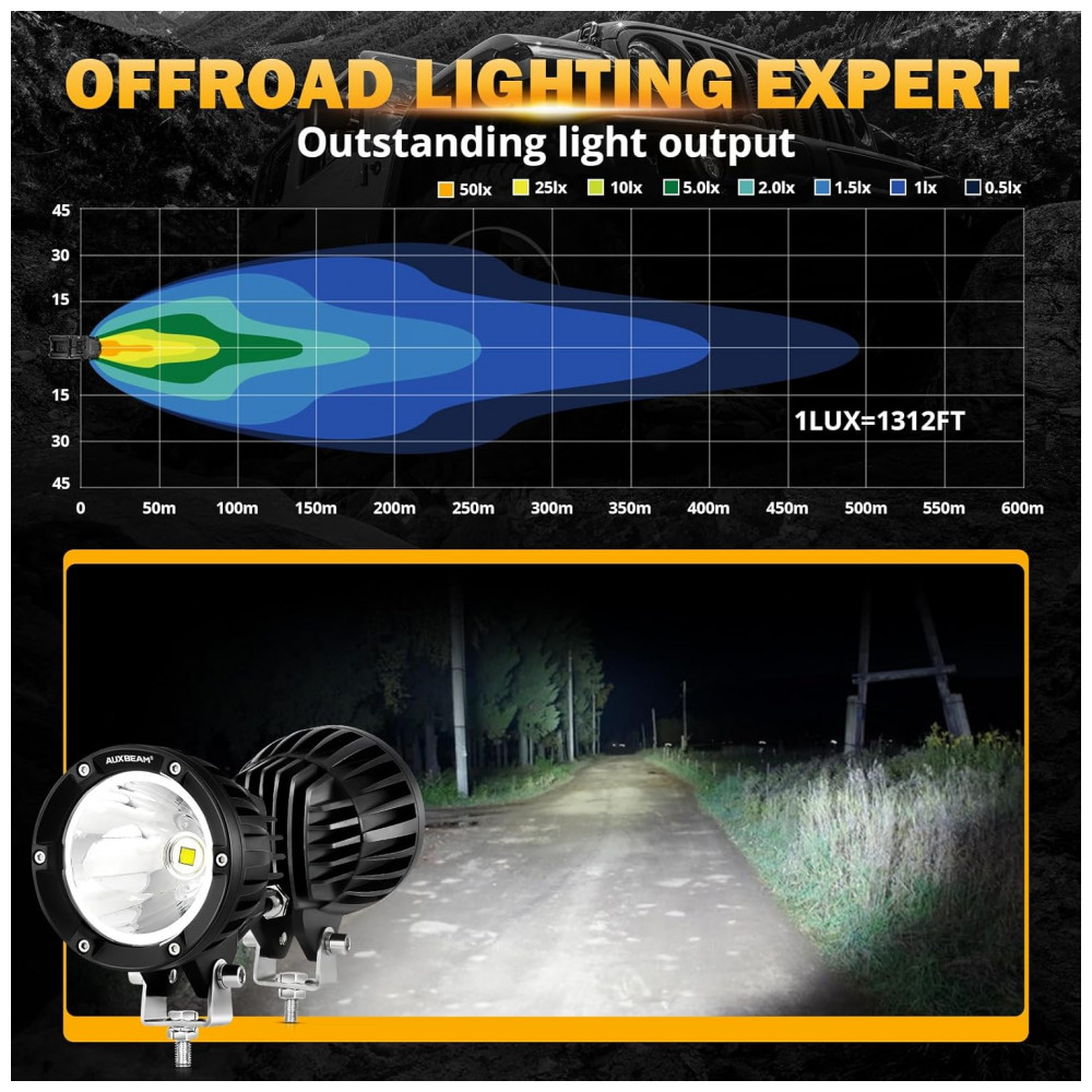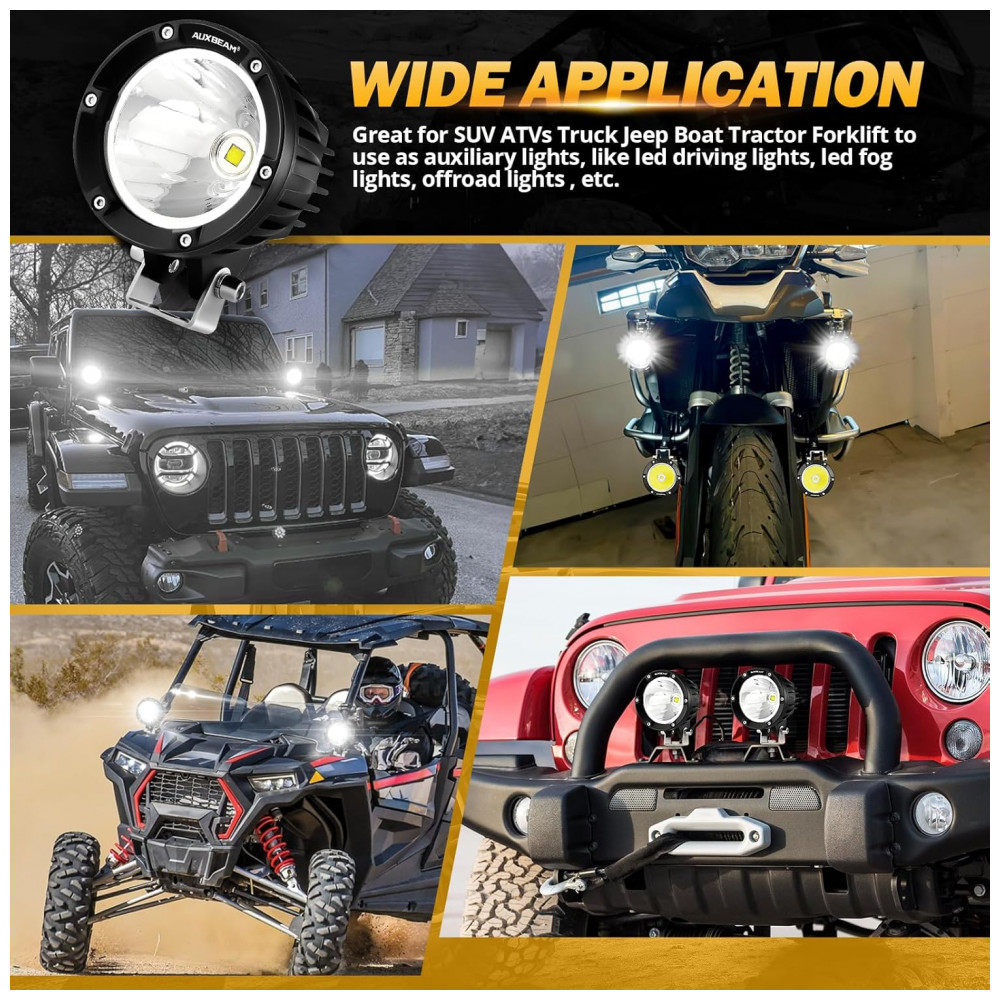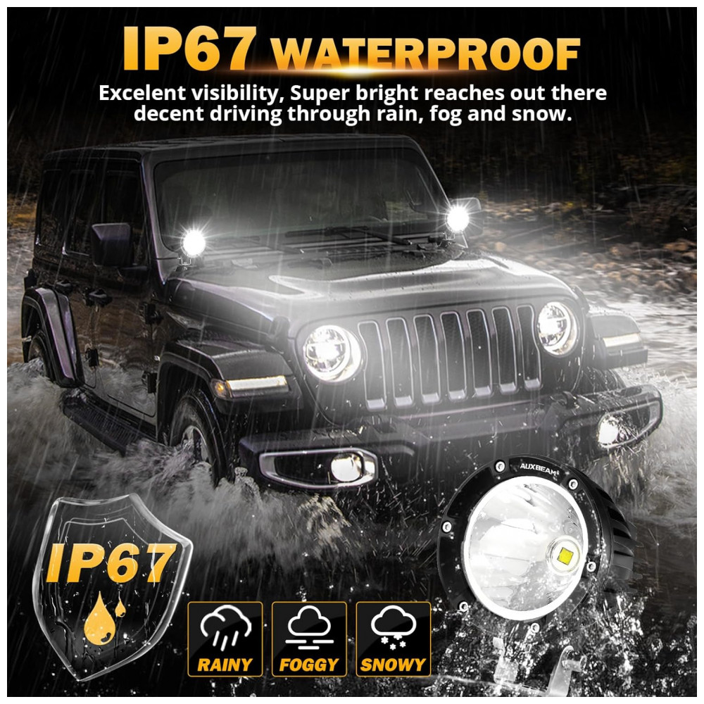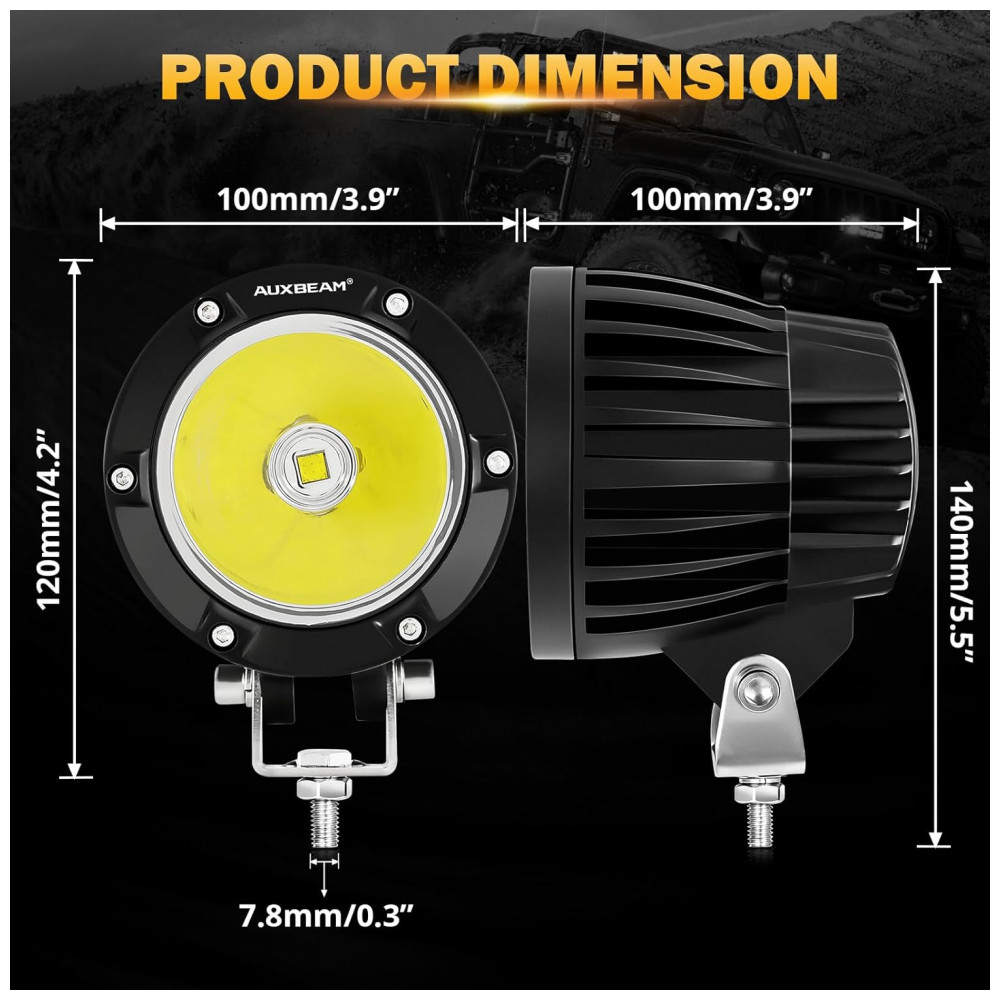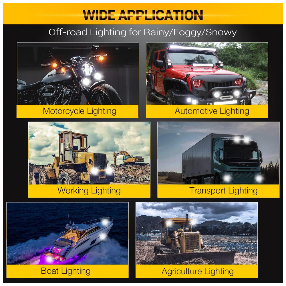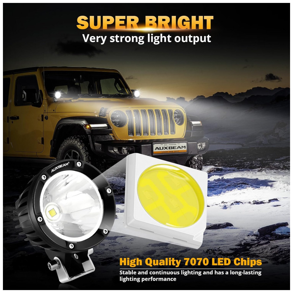 Chips de alta intensidade para super brilho. Nossa luz de condução redonda de 10 centímetros equipada com chips de led 7070 de alta potência de 72W, design de ângulo de copo refletor e lente de policarbonato com revestimento rígido pode ajustar efetivamente o ângulo de reflexão da luz. experiência de direção.