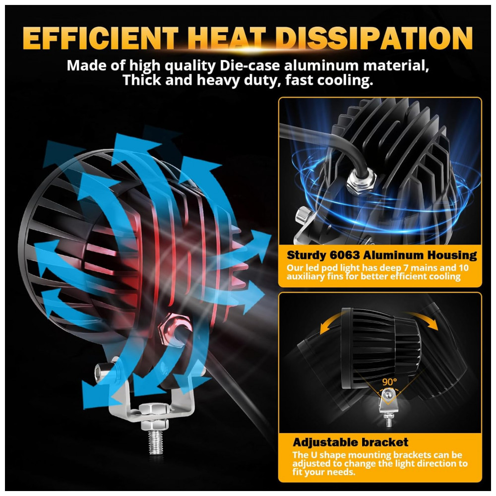 Excelente resfriamento eficiente para longa vida útil. Feito de carcaça de alumínio de aviação 6063 com 7 canos principais e 10 aletas auxiliares, maximiza a área de superfície para resfriamento eficiente, aumenta a vida útil de até 50.000 horas. Os duráveis suportes de montagem em aço inoxidável em forma de U podem ser ajustados para alterar a direção da luz de acordo com suas necessidades.