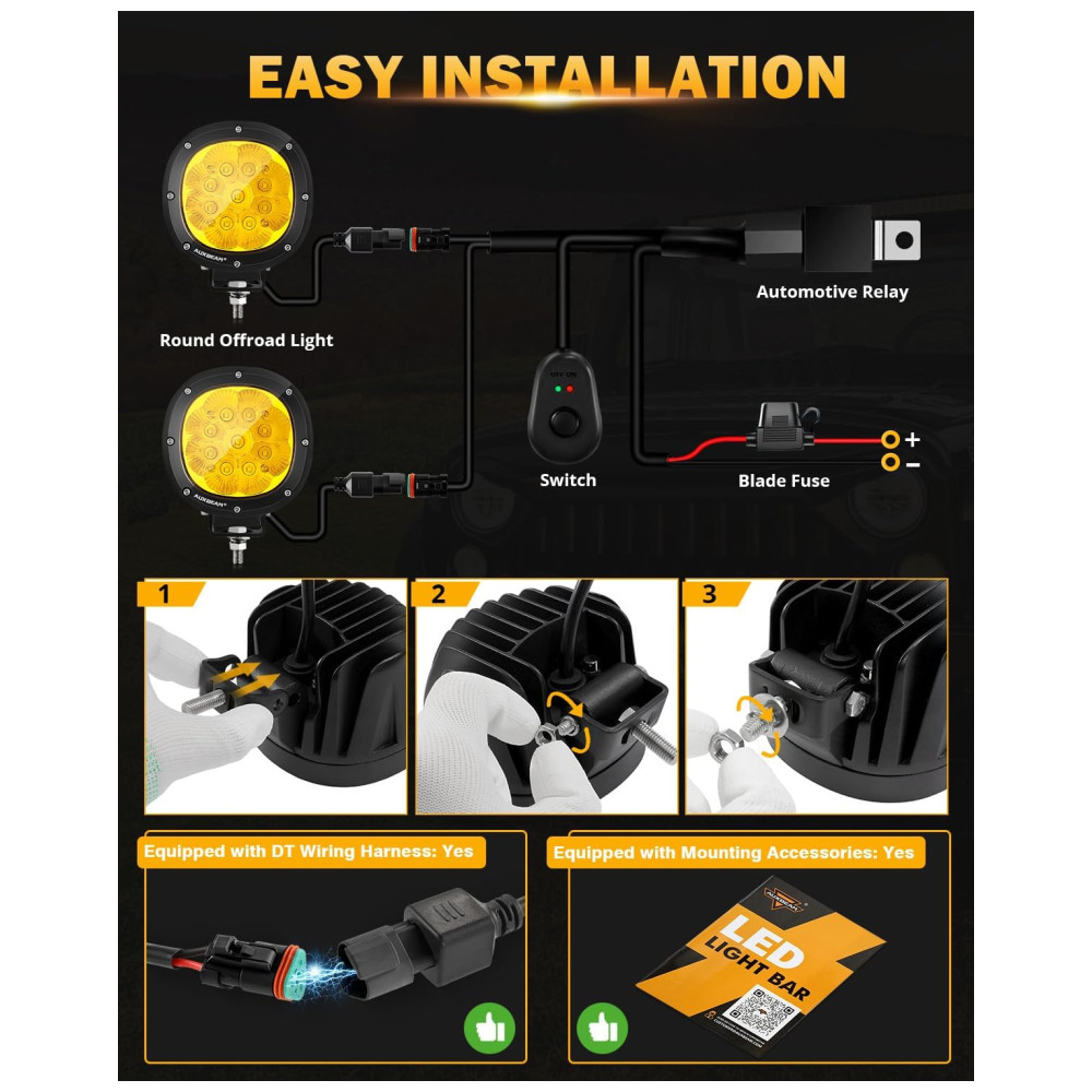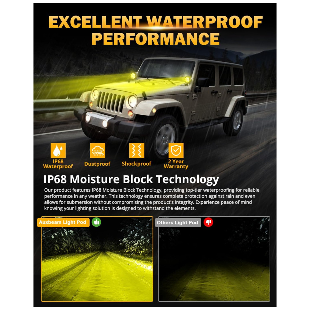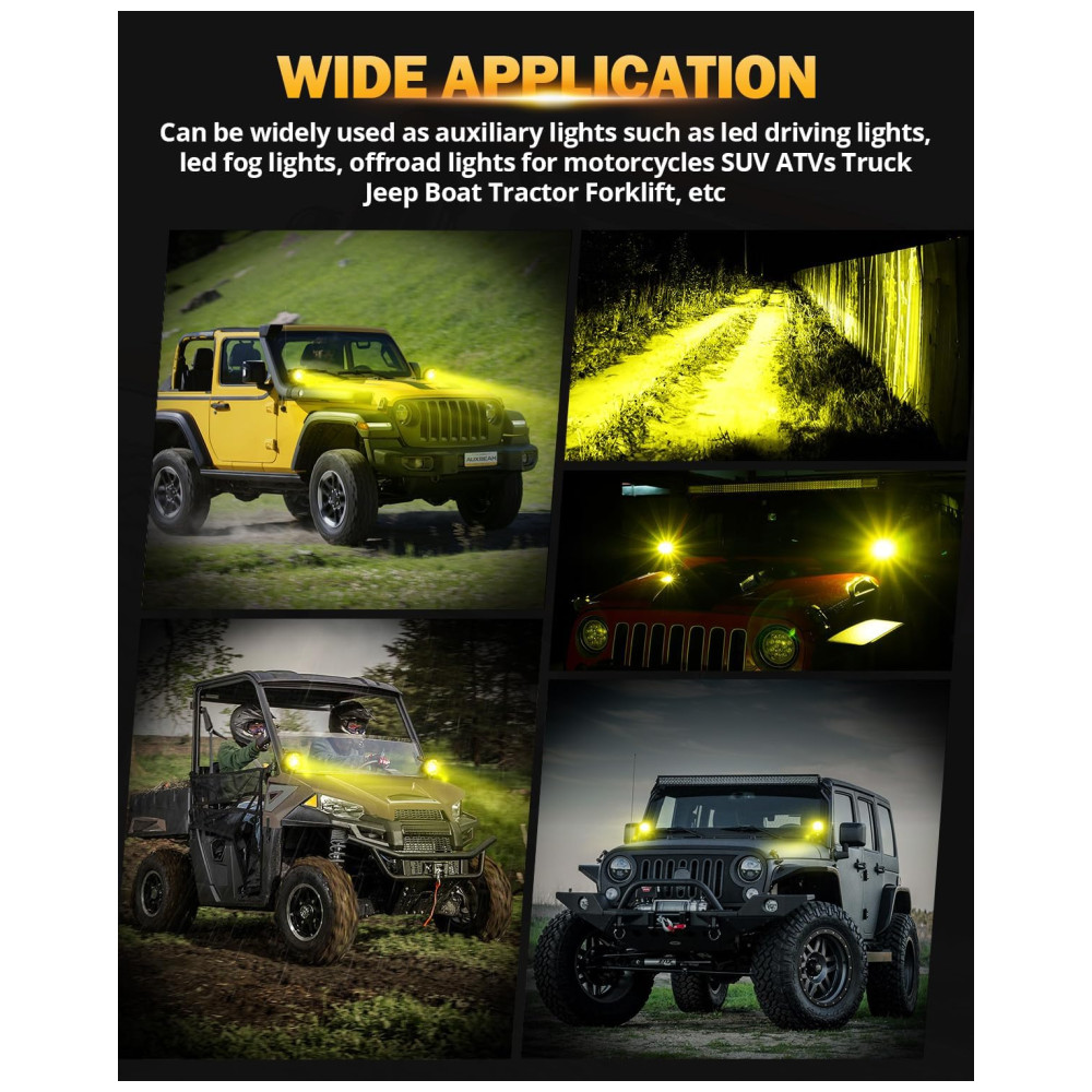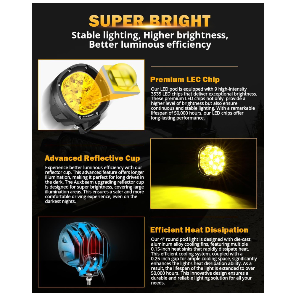 SUPER BRILHANTE A luz de direção redonda de 10 centimetros usa os chips avançados de led com alto lúmen, alto brilho Cada luz equipada com chip led 9pcs 5w 3535, emite luz superbrilhante de 9000lm e fornece feixe âmbar de 3200K, muito mais brilhante do que o pod de luz padrão ou outro pod de luz