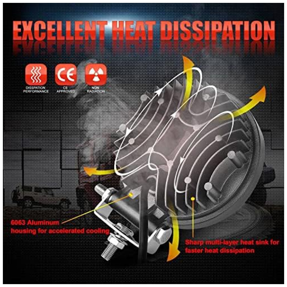 EXCELENTE DISSIPAÇÃO DE CALOR Adotando a liga de alumínio 6063 como alojamento para melhor dissipação de calor. O design nítido do ventilador de alumínio de múltiplas camadas faz com que ele dissipe o calor de maneira mais rápida e eficaz. Estende a vida útil para mais de 50.000 horas efetivamente. SUPORTES DE MONTAGEM AJUSTÁVEIS Com acessórios de montagem ajustáveis, a luz de trabalho LED redonda pode ser ajustada em cerca de 180 graus, que pode ser instalada em qualquer posição desejada. Isso facilita a alteração da direção do feixe de luz.