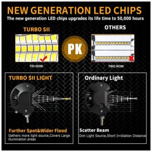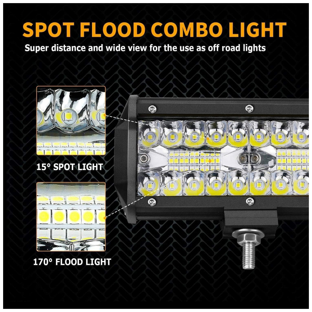 Feixe combinado SpotFlood: Barra de luz LED Turboo com chips avançados de qualidade superior de 120pcs, fornecendo 24.000lm e emitem luz branca brilhante de 6.500k, pode iluminar toda a estrada escura dianteira. O copo exclusivo da lâmpada com ângulo de foco de 15 projetado e a iluminação de inundação de 170 alcançam uma faixa de iluminação mais ampla.