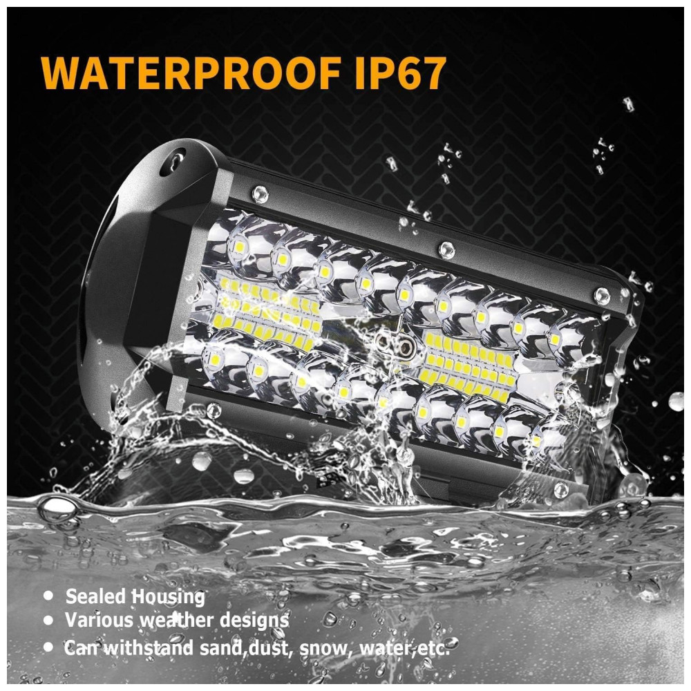 Design à prova dágua IP67: A barra de luz de 120 W é hermeticamente selada com caixa totalmente de alumínio e proteção perfeita com cola à prova dágua, ótimo desempenho à prova dágua, à prova de poeira e à prova de terremotos. Esta luz de condução LED de 24000lm também pode funcionar normalmente mesmo em ambientes adversos, como estradas chuvosas ou com buracos.