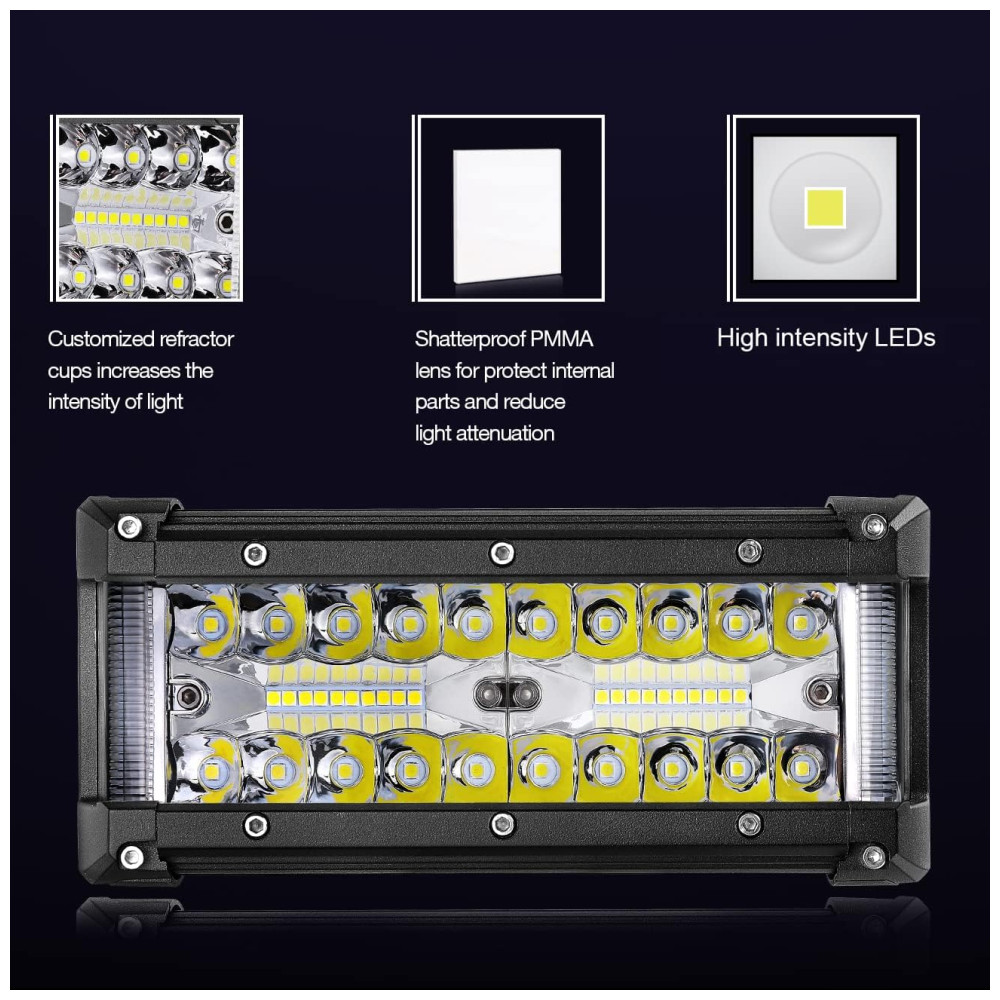 PROJETO MAIS RECENTE Essas lâmpadas LED de 7 contêm excelentes LEDs CREE de alta intensidade e filas triplas circundadas por refletores ópticos para maximizar a utilização da luz e LEDs de disparo lateral extra. Os LEDs 100pcs totais visam emitir 300 watts e 30.000 lumens de potência poderosa de 6000k brancos reais luz super brilhante. Este pod de luz de atirador lateral equipado com 2 suportes de montagem duráveis para aumentar a estabilidade e durabilidade, iluminando toda a sua estrada sem quaisquer escrúpulos.