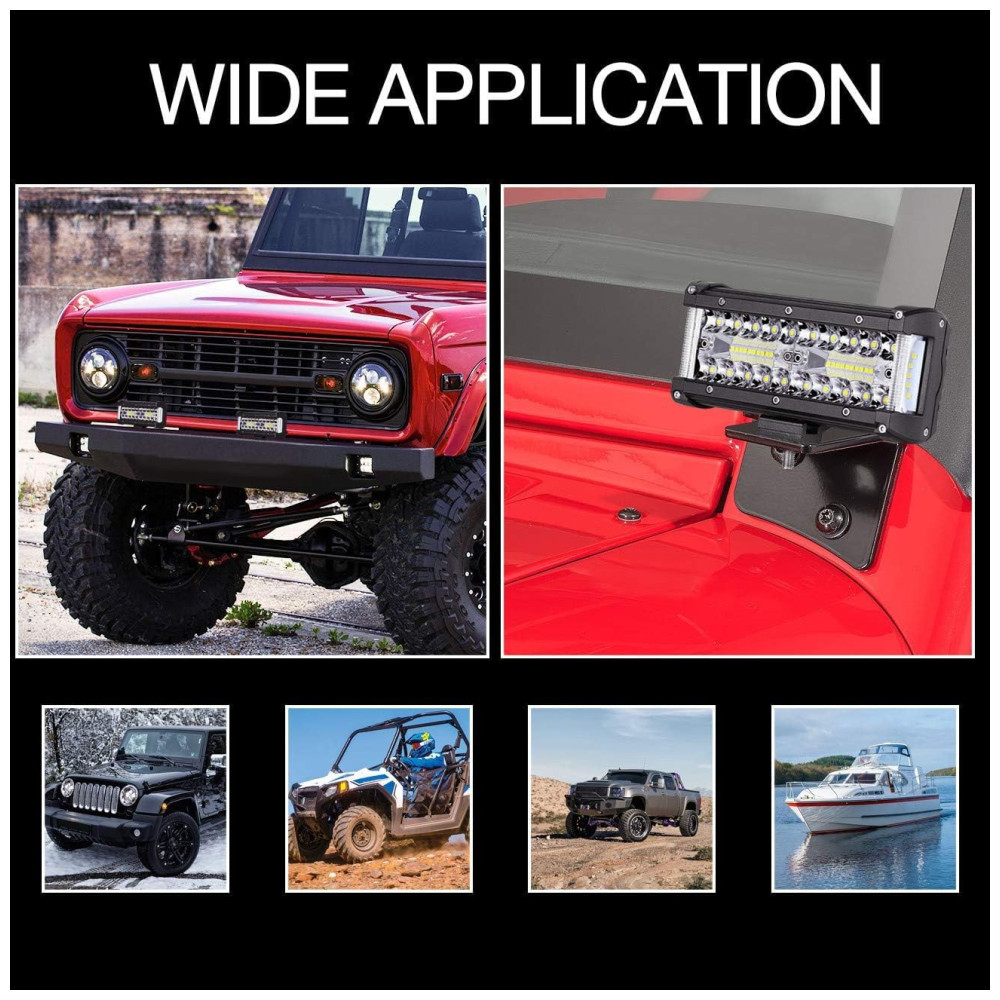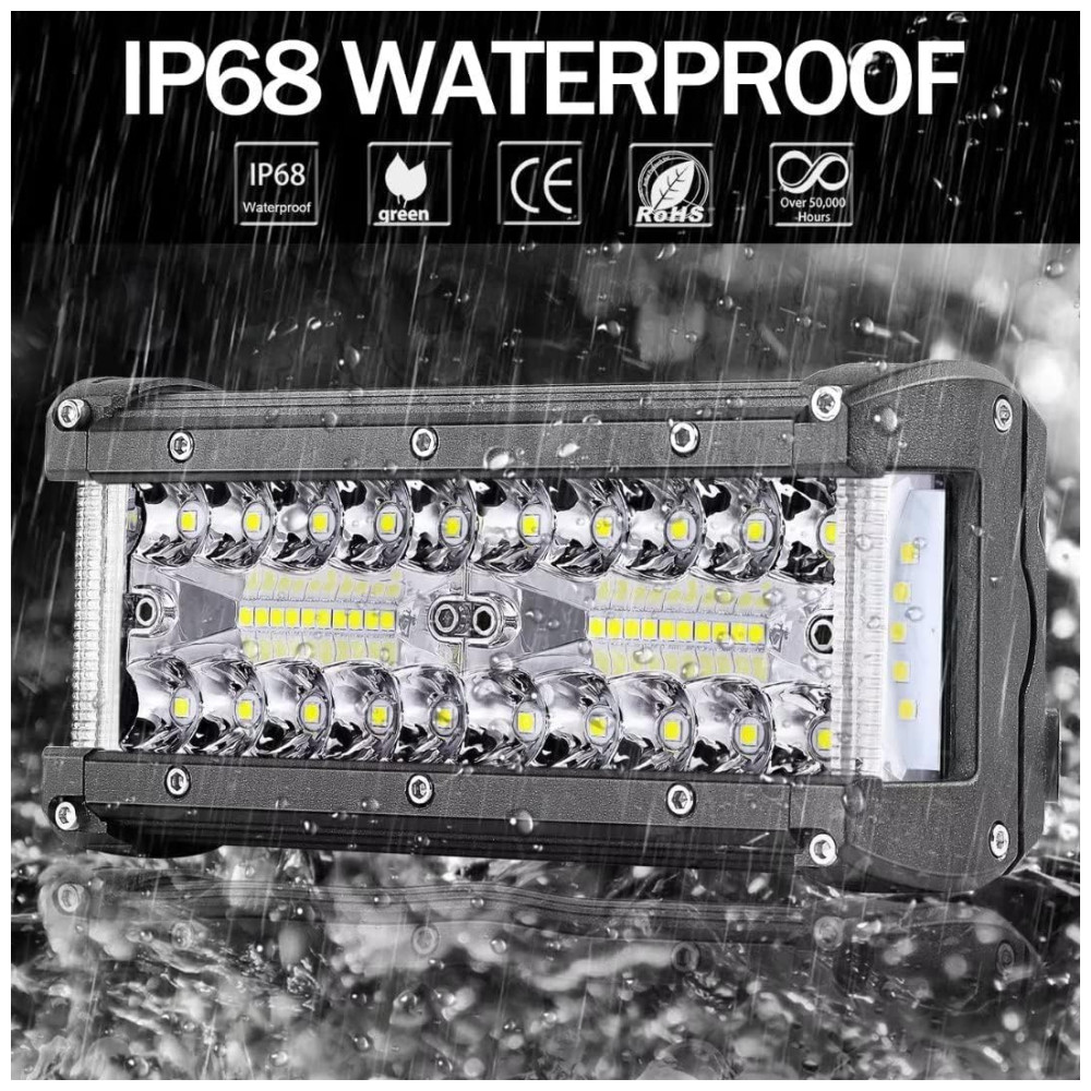 PINÁCULO DE DESEMPENHO A luz off road passou no teste de classificação IP68, é à prova dágua, à prova de poeira, à prova de ferrugem, à prova de choque, anticorrosiva e resistente à condensação, pode suportar os ambientes mais adversos. Excelente dissipador de calor de alumínio condutor de calor efetivamente dissipar o calor, melhor efeito de resfriamento e maior vida útil superior a 50.000 horas. Os suportes de montagem podem ser ajustados em 45 , o que torna a mudança de direção do feixe de luz mais fácil.