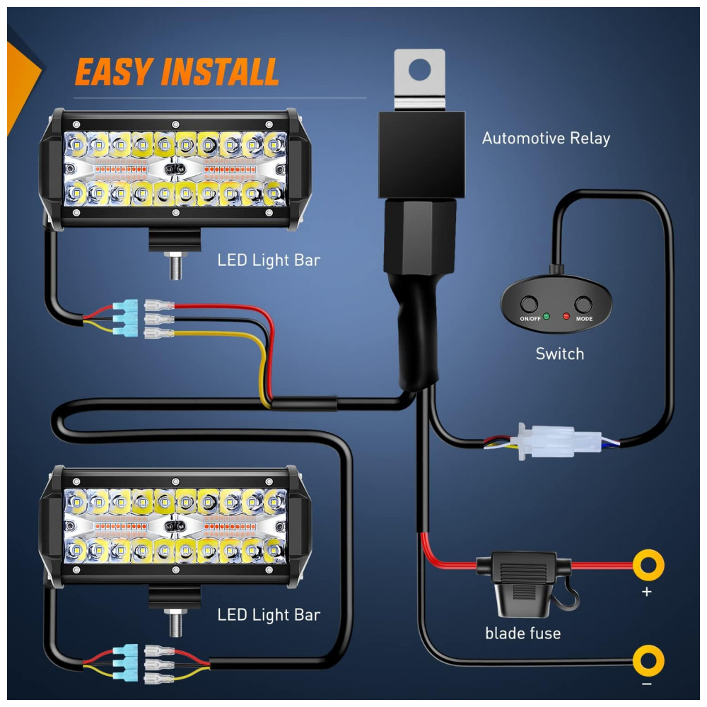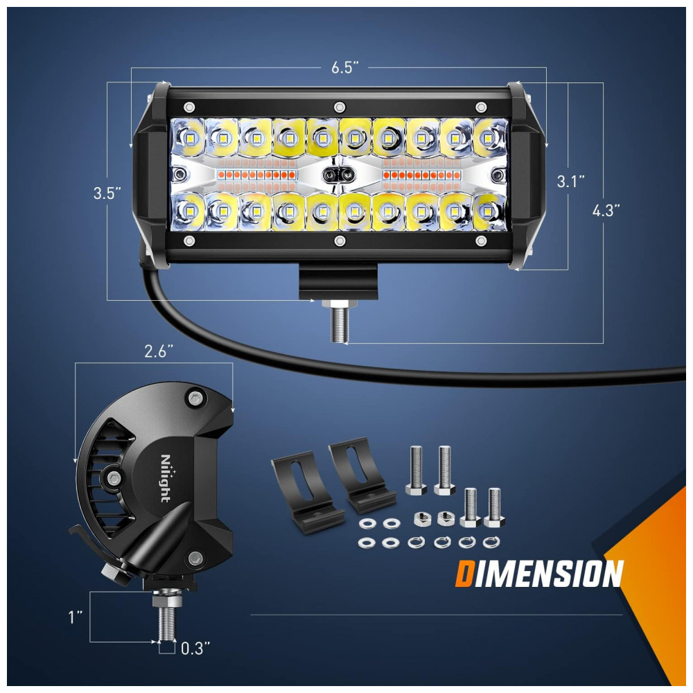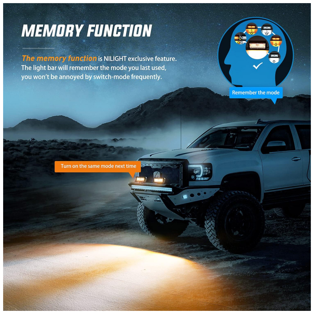 6 Modos com função de memória: regule o modo, por sua vez, comutando as luzes branco , âmbar , branco e âmbar , estroboscópio âmbar , estroboscópio âmbar , branco e âmbar . A barra de luz lembrará o modo pela última vez, você não ficará irritado com o modo de comutação com frequência. É ótimo usar para luzes de aviso, luzes de nevoeiro, luzes de condução ou luzes de trabalho. Venha com o kit de chicote de fios da versão atualizada NILIGHT