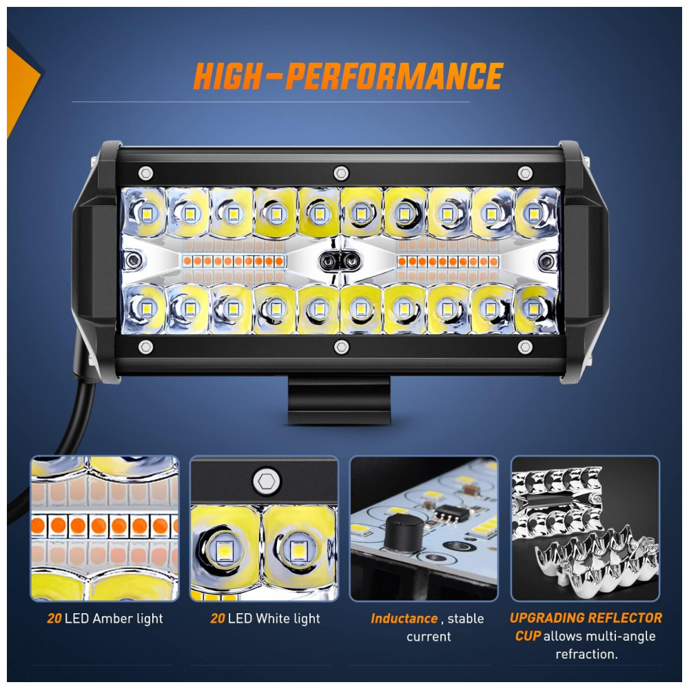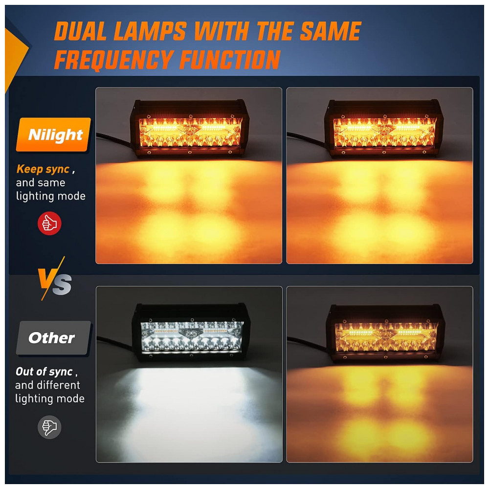 Feixe combinado perfeito: excelente efeito visual, com 20 luzes âmbar LED de alta potência e 20 luzes brancas LED de alta potência e corrente estável. A atualização do copo refletor permite refração de vários ângulos. E o recurso de atualização exclusivo NILIGHT, sempre mantenha a sincronização e o mesmo modo de iluminação, você não será incomodado pelo modo de luz fora de sincronização