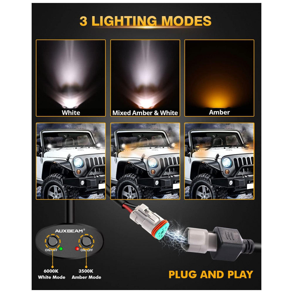 Nosso design DRL é realmente único. Adicionamos uma função de luz DRL âmbar que funciona em conjunto com a nossa luz branca ultra brilhante. Não apenas alerta outros motoristas em condições de neblina ou chuva, mas também complementa outros faróis fracos do seu veículo. Esse recurso também adiciona um toque de estilo de moda e eleva sua aparência geral