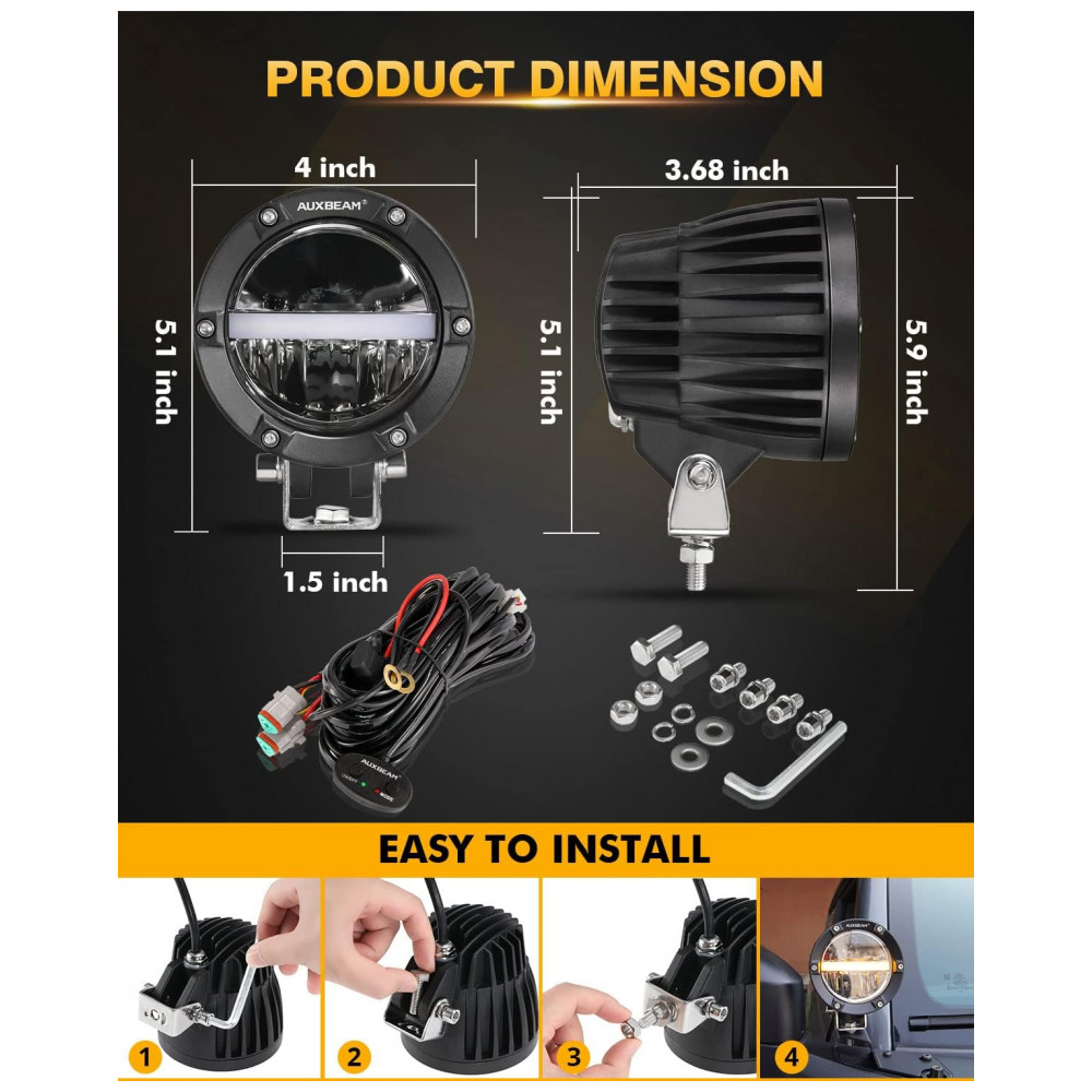 Super Brilho: Atualização da tecnologia de chips de 3a geração. Luzes off road led redondas de 4 equipadas equipadas com chips LED de alta intensidade de 110w, chips ultra fortes de dupla face podem emitir luz branca super brilhante de 11000LM, tornando o mais e conveniente em ambientes com pouca luz ou à noite