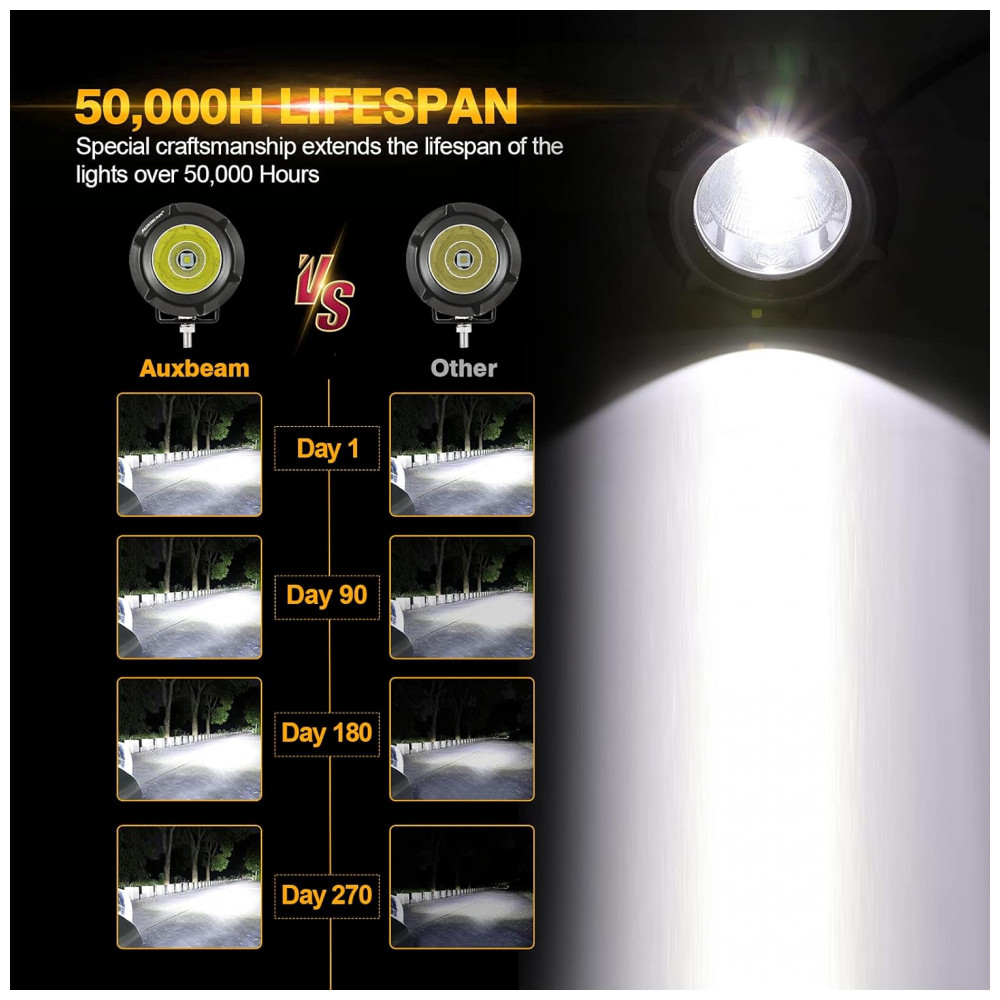 Padrão de feixe combinado e espalhado. A luz de condução redonda do Auxbeam de 50W apresenta um padrão de feixe combinado, com refletores Spot Spread perfeitamente angulados, para máxima distância à frente e iluminação periférica aprimorada ao longo das bordas da estrada