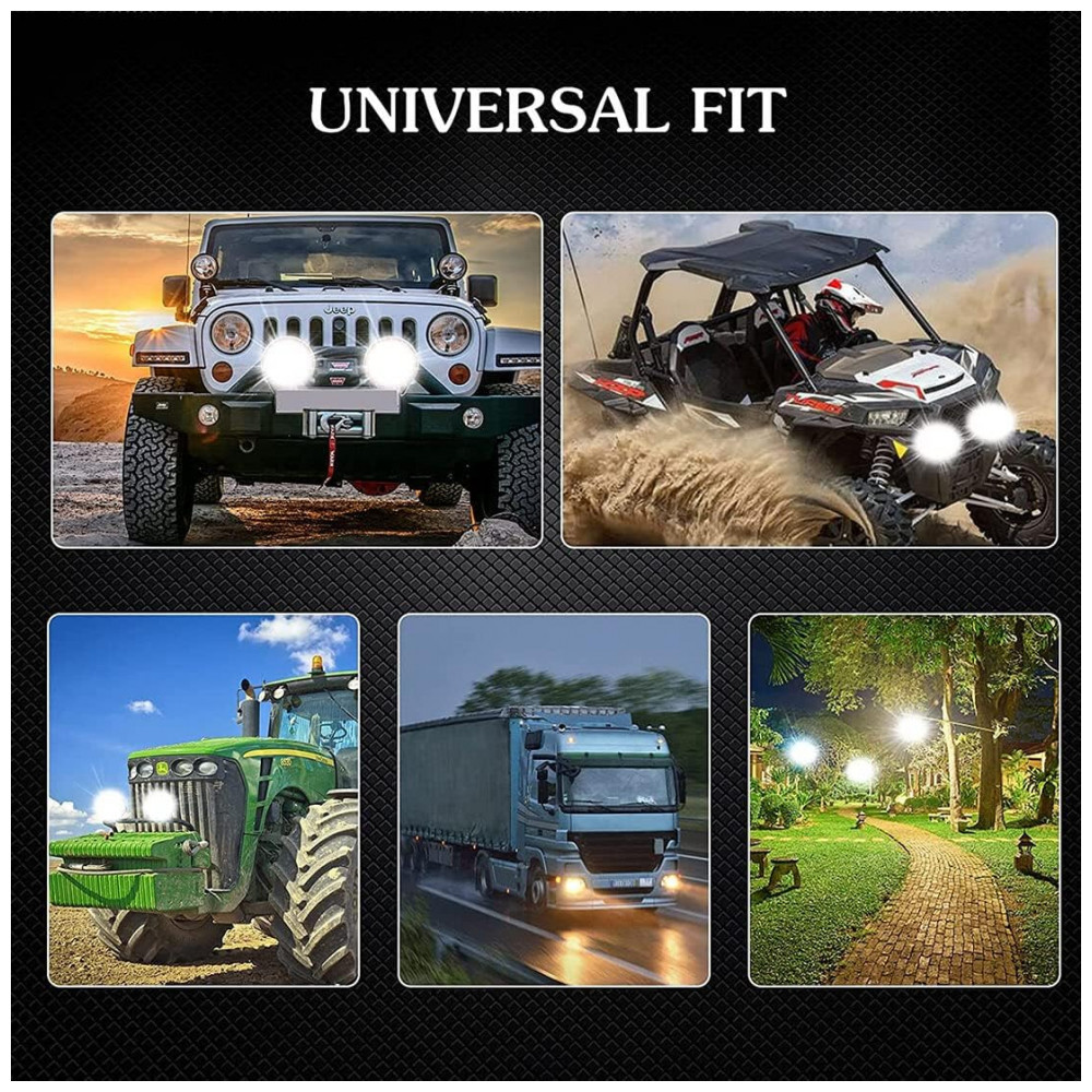 AMPLA APLICAÇÃO as cápsulas de luz LED redondas se adaptam à maioria das luzes offroad, luzes diurnas ou faróis de neblina, luzes de para choque, luzes de rack de teto em Jeep, 4X4, carro, ATV, UTV, SUV, pick up, caminhões, trailer, empilhadeira, motocicleta, jeep Wrangler TJ.E também como barco, iluminação externa, iluminação industrial, iluminação marítima e iluminação de trator, jardins, quintais, garagens, etc.