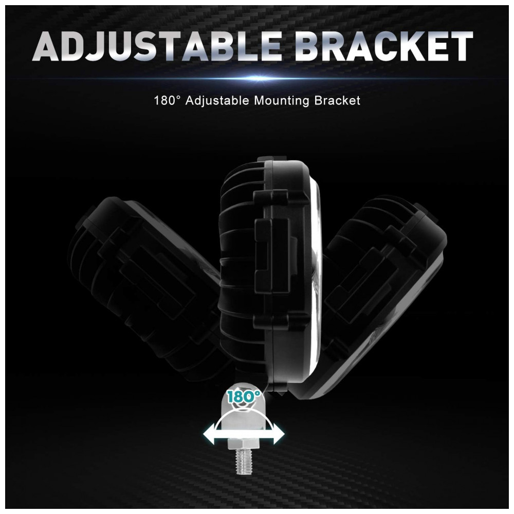 Suporte de montagem ajustável Com o suporte da barra de luz ajustável, a luz de trabalho pode ser ajustada para cerca de 180 graus, o que facilita a mudança de direção do feixe de luz.
