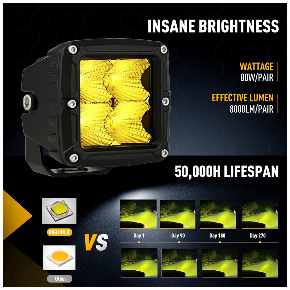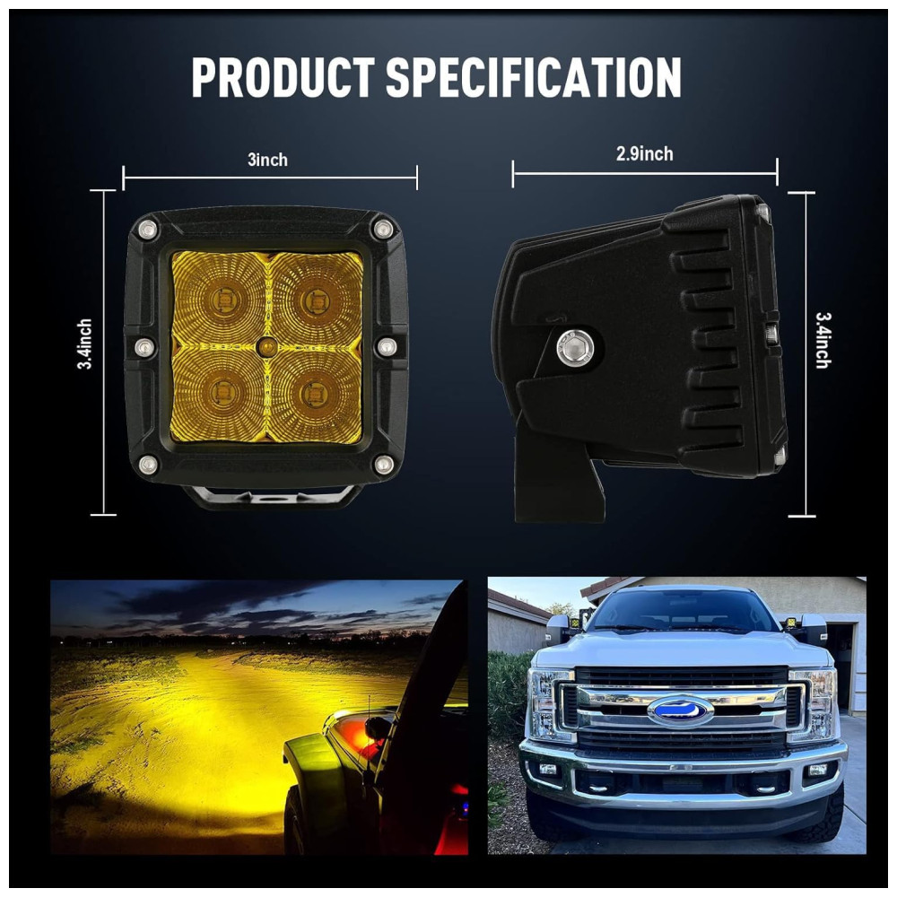 APLICAÇÕES LARGAS As luzes de vagem de âmbar podem caber em diferentes tipos de veículos. Cubos de âmbar adequados para picapes, caminhões, automóveis, utilitários esportivos, utilitários esportivos, barco, van, reboque, veículo do projeto, fora de estrada, 4×4, 6×6, 4WD, iluminação agrícola, vagão, veículo de mineração, motocicletas, caminhão , equipamento pesado, veículo de emergência, etc.