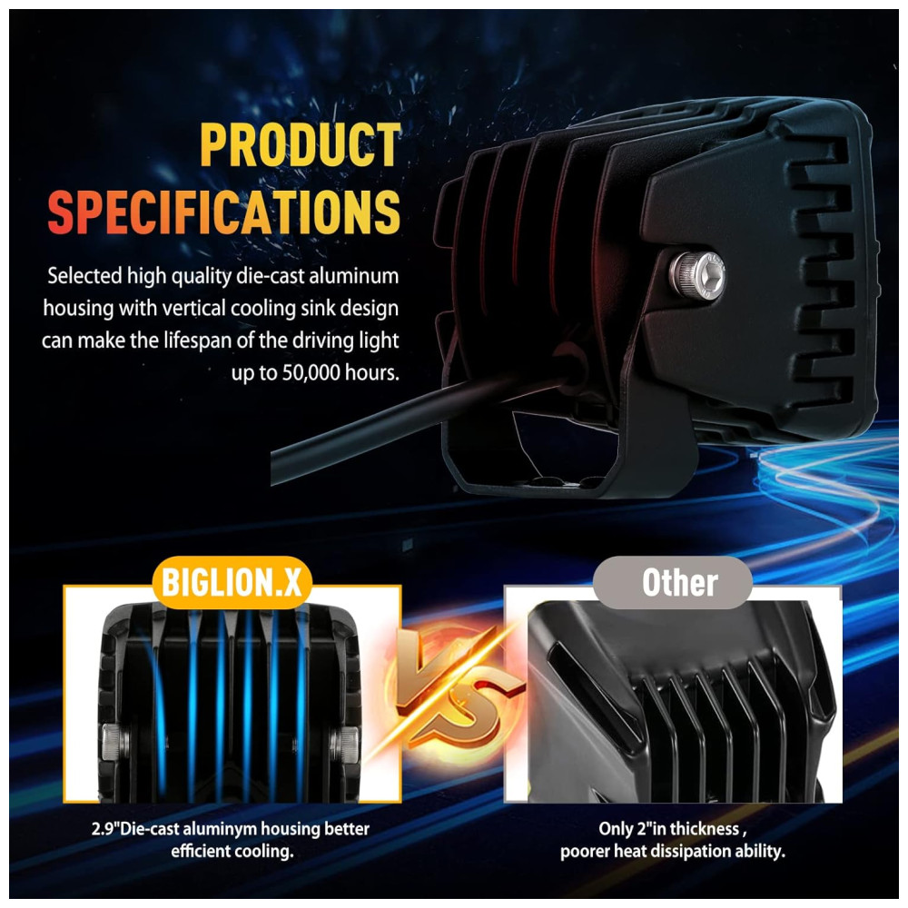 Farol de Milha LED Off Road com 8000 Lúmens e Luz Âmbar IP68 11V A 30V 80W 2Un BIGLION.X Preto
