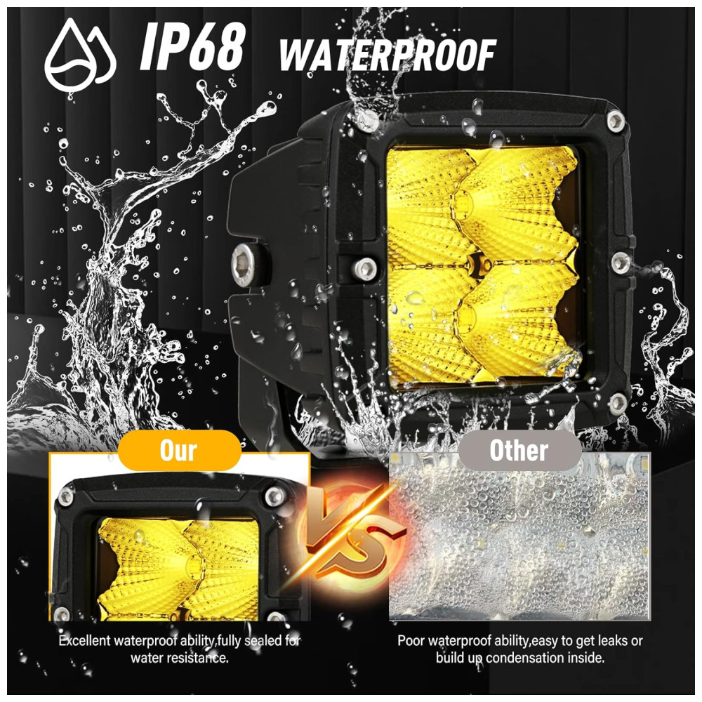 MONTAGEM FÁCIL, HARDWARE DE ALTA QUALIDADE Dimensão de 7,62 x 7,37 x 8,64 centímetros, com parafusos e porcas antiderrapantes, suportes angulares ajustáveis. A luz do cubo de condução âmbar de tamanho pequeno pode ser instalada facilmente na barra de touros, para choques, porta telhado, capuz, atrás da grade, pelo para brisa. Placa PCB de alta condutividade térmica, caixa de alumínio ADC12 de alta resistência, luzes de inundação podem conduzir o calor rapidamente. A superfície da carcaça é tratada com parafusos de aço inoxidável 316 à prova de neblina de sal, é antiferrugem e mais durável.
