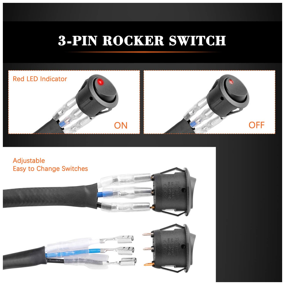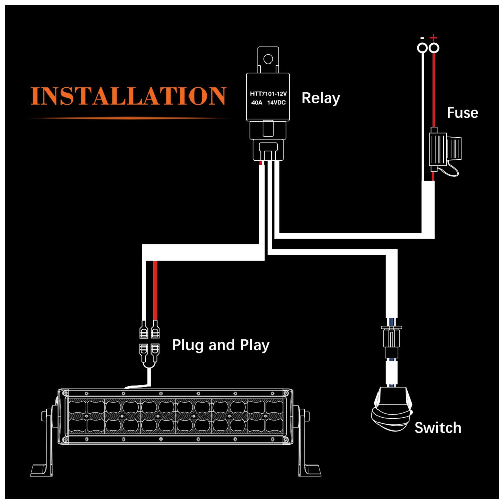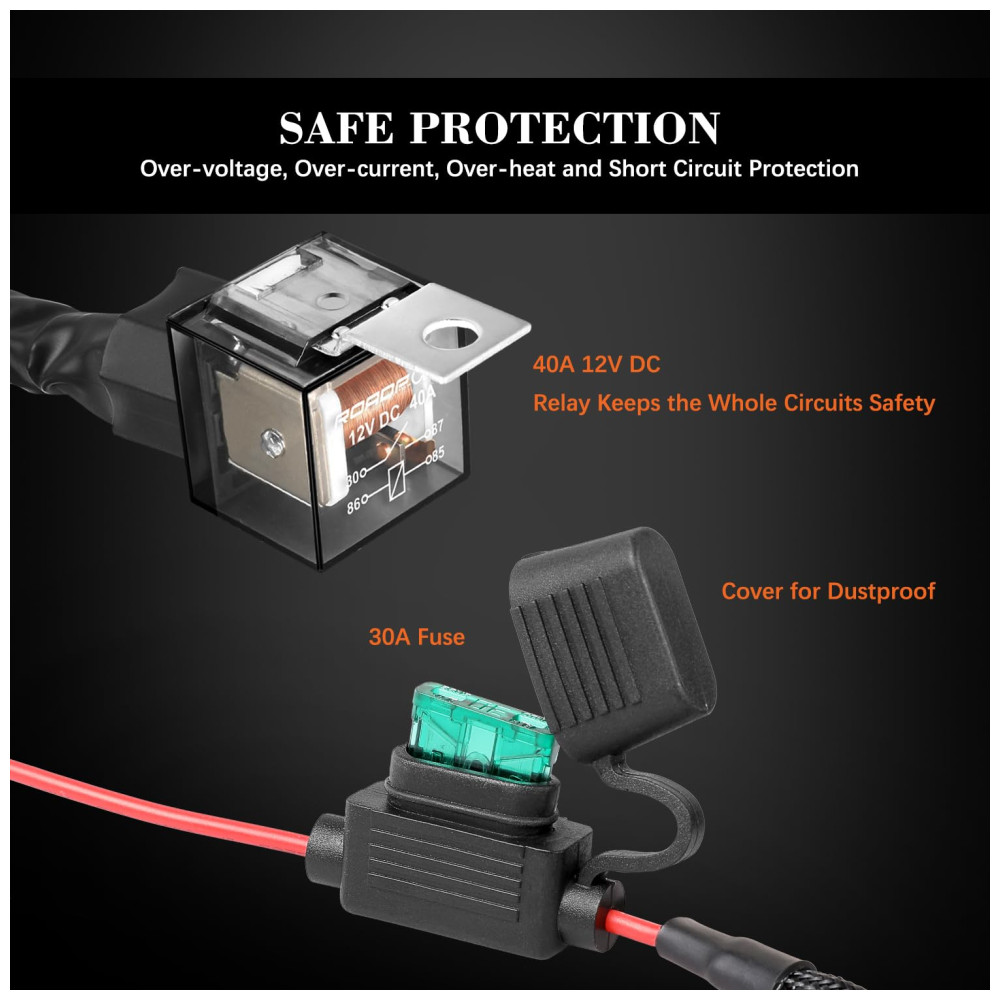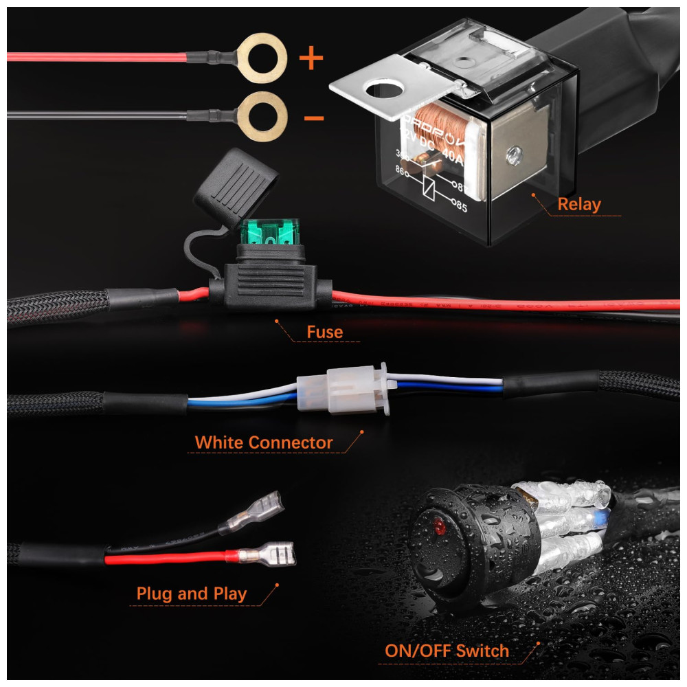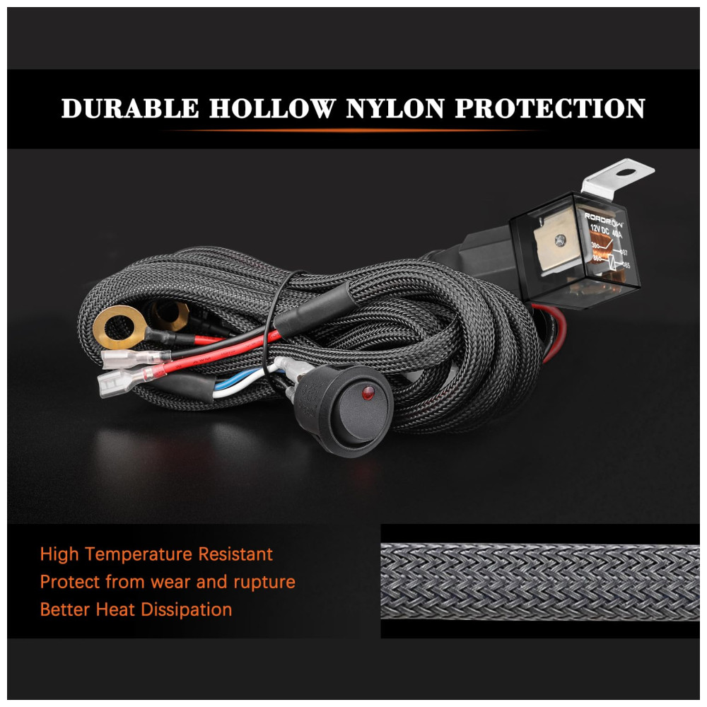 LARGOS USOS. Nosso chicote de fios de barra de luz LED tem 1 derivação com capacidade de carga de 200W, é universal para qualquer barra de luz de qualquer tamanho, luzes fora de estrada, luzes de trabalho LED e luzes de nevoeiro dentro de 200W. Compatível com todos os automóveis, barcos e dispositivos equipados com uma fonte de energia de 12V 30V. Até 2,5 metros de comprimento suficiente para usá lo onde quiser. PROJETO EXCLUSIVO. Os fios de cobre de fio flexível são enrolados pelo PVC de classificação AWM que isola até 105, a camada de nylon oca durável e altamente resistente à temperatura, protege a fiação contra desgaste e ruptura e melhor dissipação de calor. PROTEÇÃO SEGURA. Este kit de cablagens possui fusível 30A e relé 40A 14V, é proteção contra sobretensão, sobrecorrente, superaquecimento e curto circuito para manter a segurança de todos os circuitos. CARACTERÍSTICAS. Projetado para fornecer instalação plug and play sem problemas. O interruptor ON , OFF à prova dágua possui uma sensibilidade extremamente alta e é muito fácil mudar o interruptor. Incluído no Pacote 1 chicote de cabos, 1 fusível, 1 relé, 1 chave liga , desliga