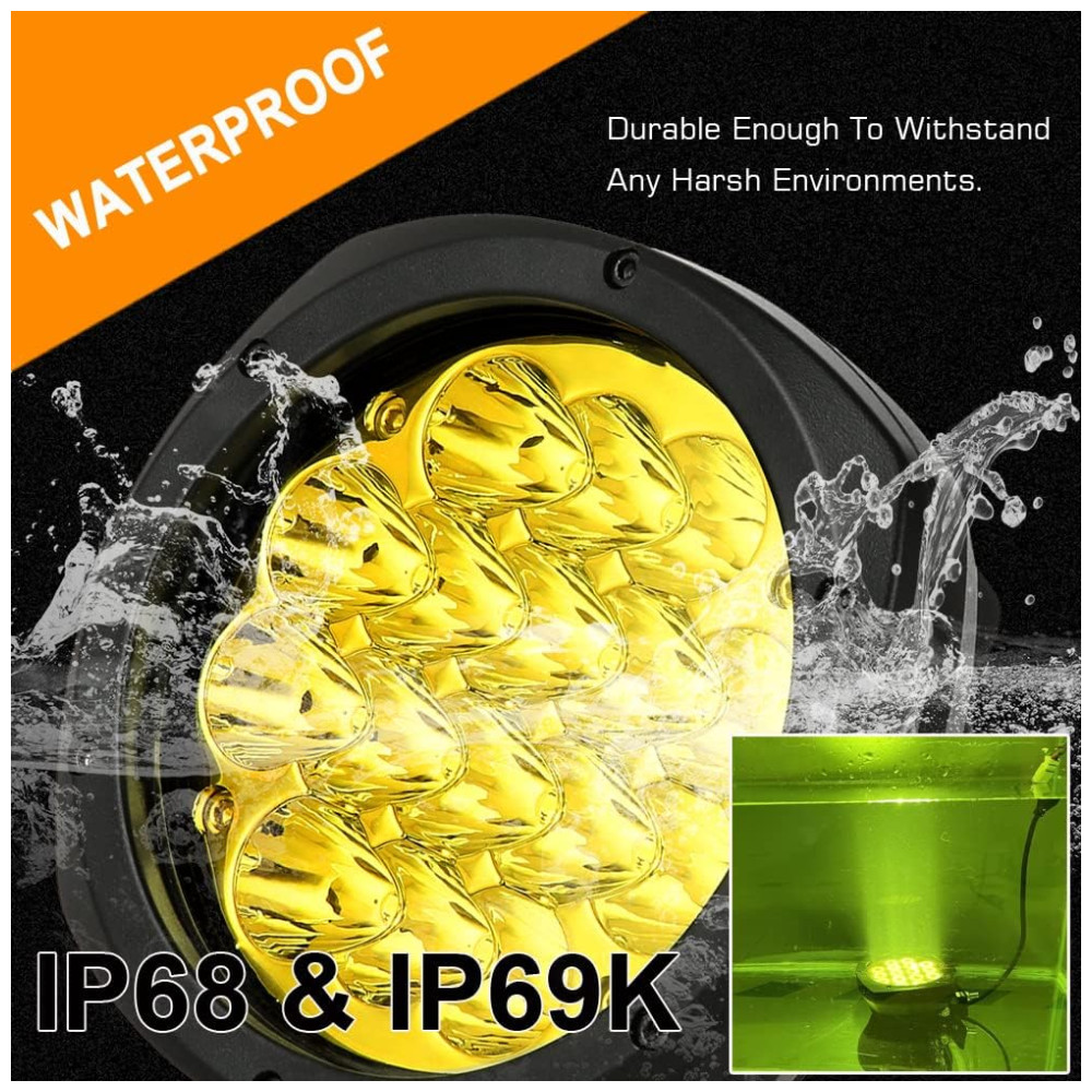 Efeito de iluminação eficiente Cada copo de luz off road Led é combinado com design de feixe de spot e flood. O feixe pontual viaja bastante e tem uma boa largura. A luz offroad âmbar emite luz âmbar super brilhante. Dê uma visão segura na maioria dos climas ruins, como dias chuvosos, dias de neblina e dias de neve, tornando a condução mais segura.
