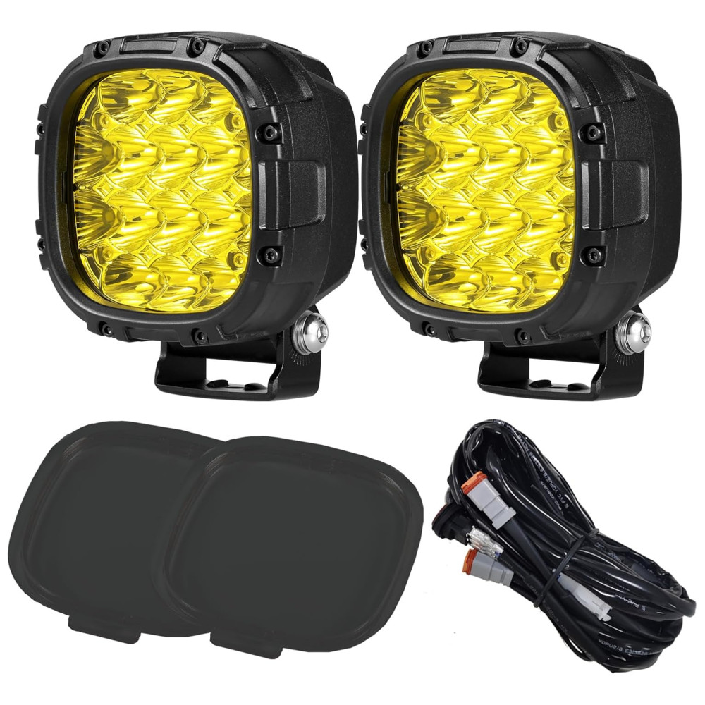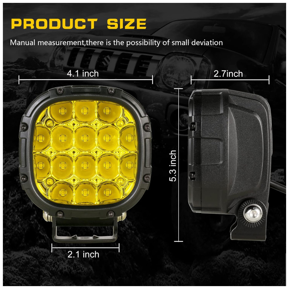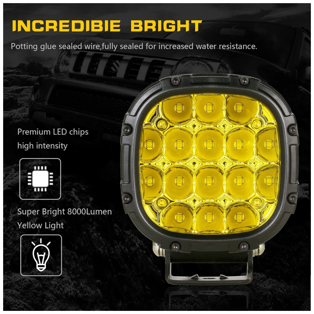 Efeito de iluminação eficiente Cada copo de luz é combinado com design de feixe de foco e inundação. O feixe pontual viaja bastante e tem uma boa largura. A luz offroad emite luz âmbar super brilhante. Luzes amarelas para caminhões oferecem uma visão segura na maioria dos climas ruins, como dias chuvosos, dias de neblina e dias de neve, tornando a condução mais segura.