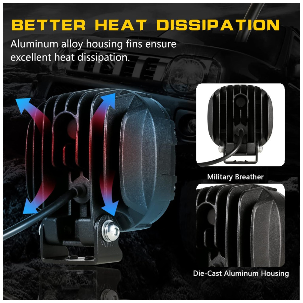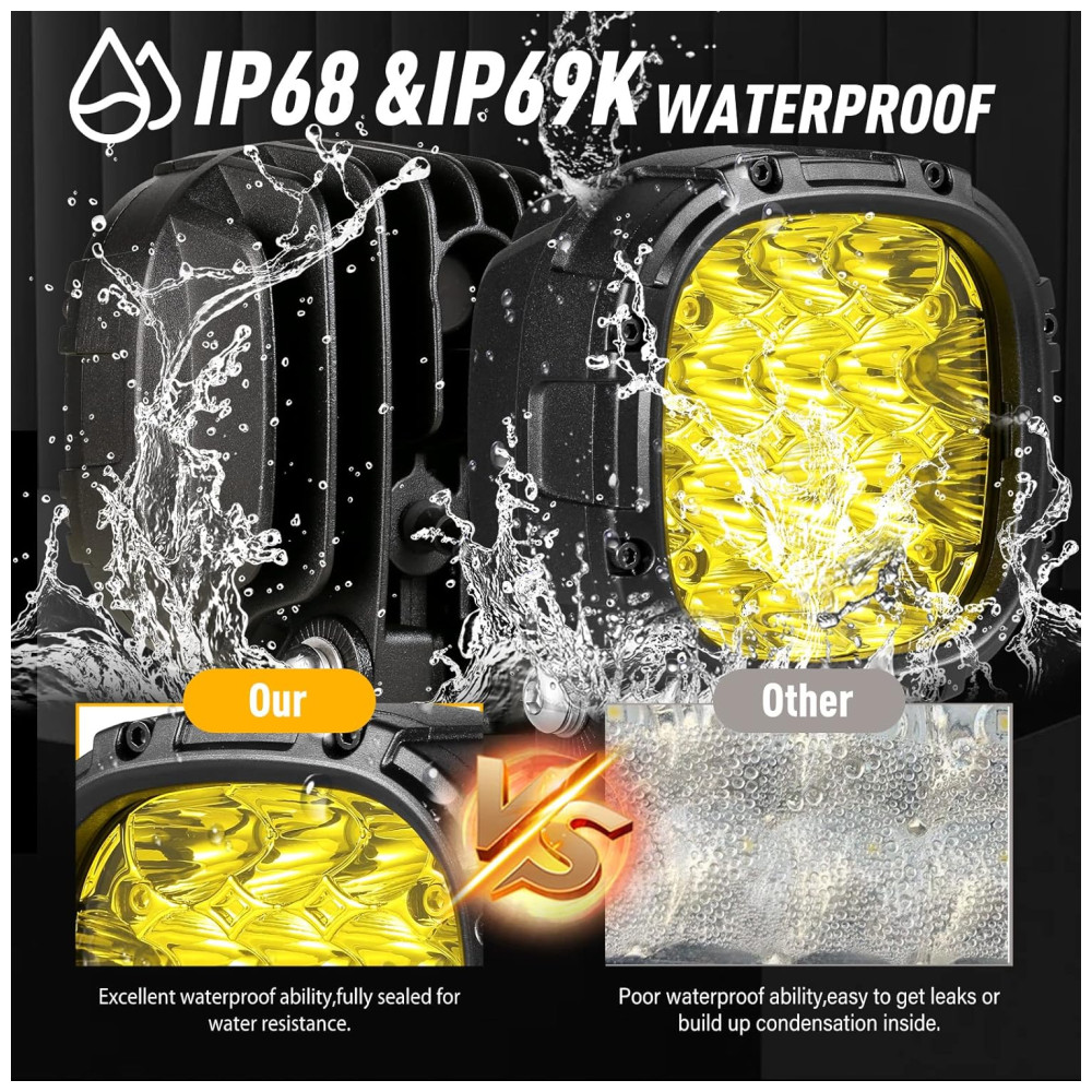 Alto padrão à prova dágua Luz led amarela em conformidade com o padrão IP68 e IP69K. Pequenos pods de led aplicaram um design de respirador militar para evitar condensação e embaçamento. Prolongue a vida útil dos pods de led âmbar. Equilibre a pressão diferencial das luzes offroad para alcançar o equilíbrio térmico. Deixe as contas de lâmpada seladas terem melhor dissipação de calor. Aumente o uso de confiabilidade em ambientes extremos.