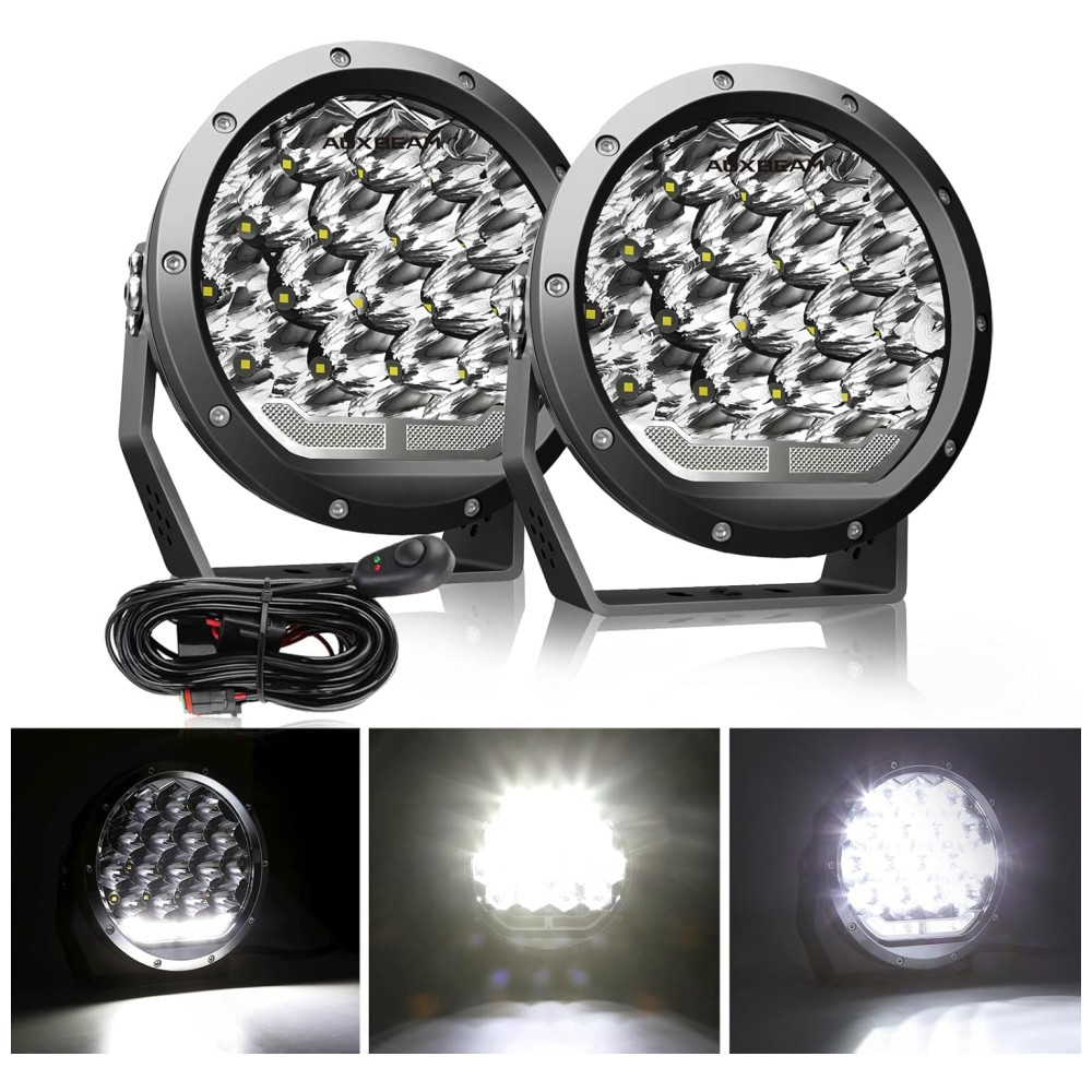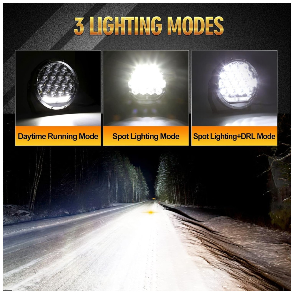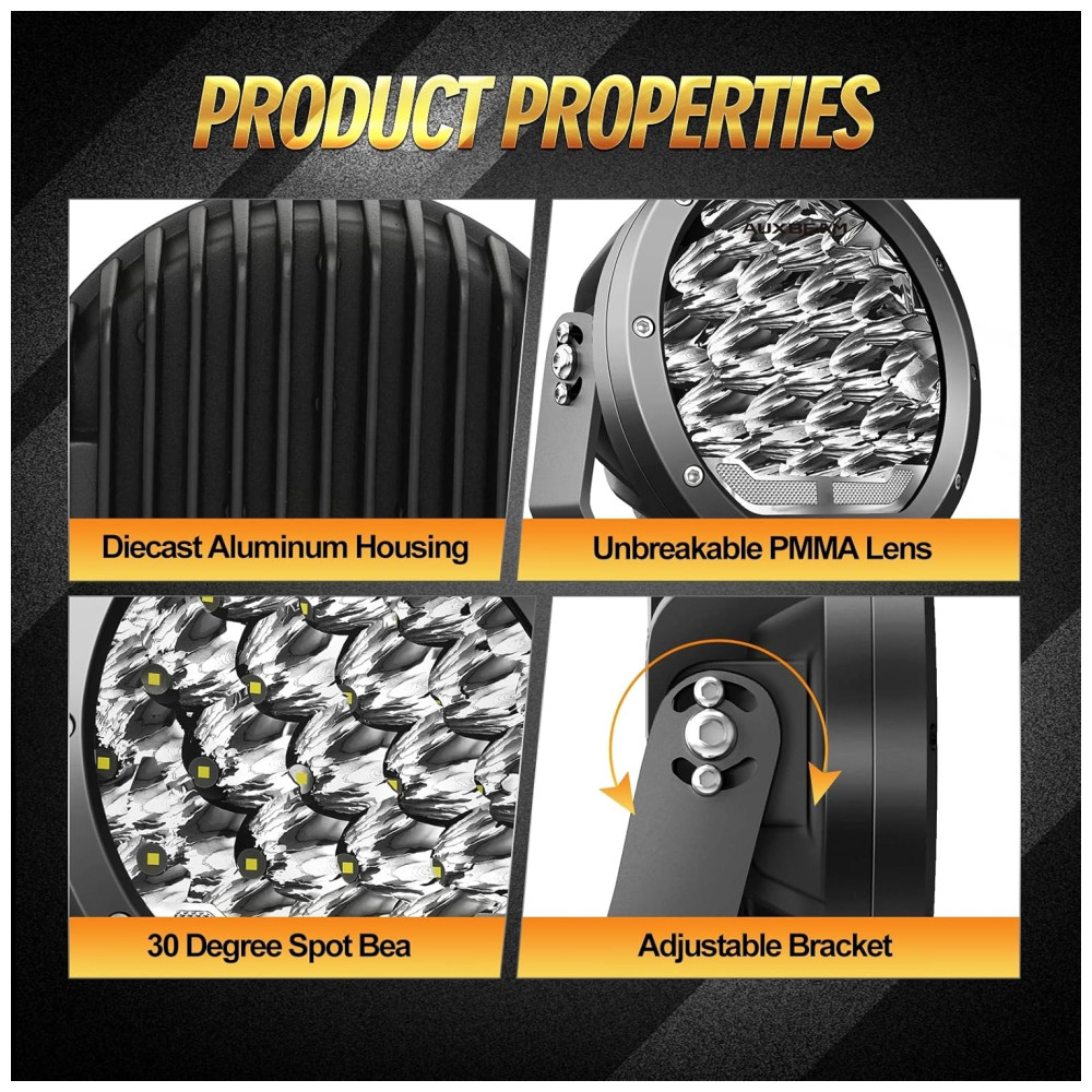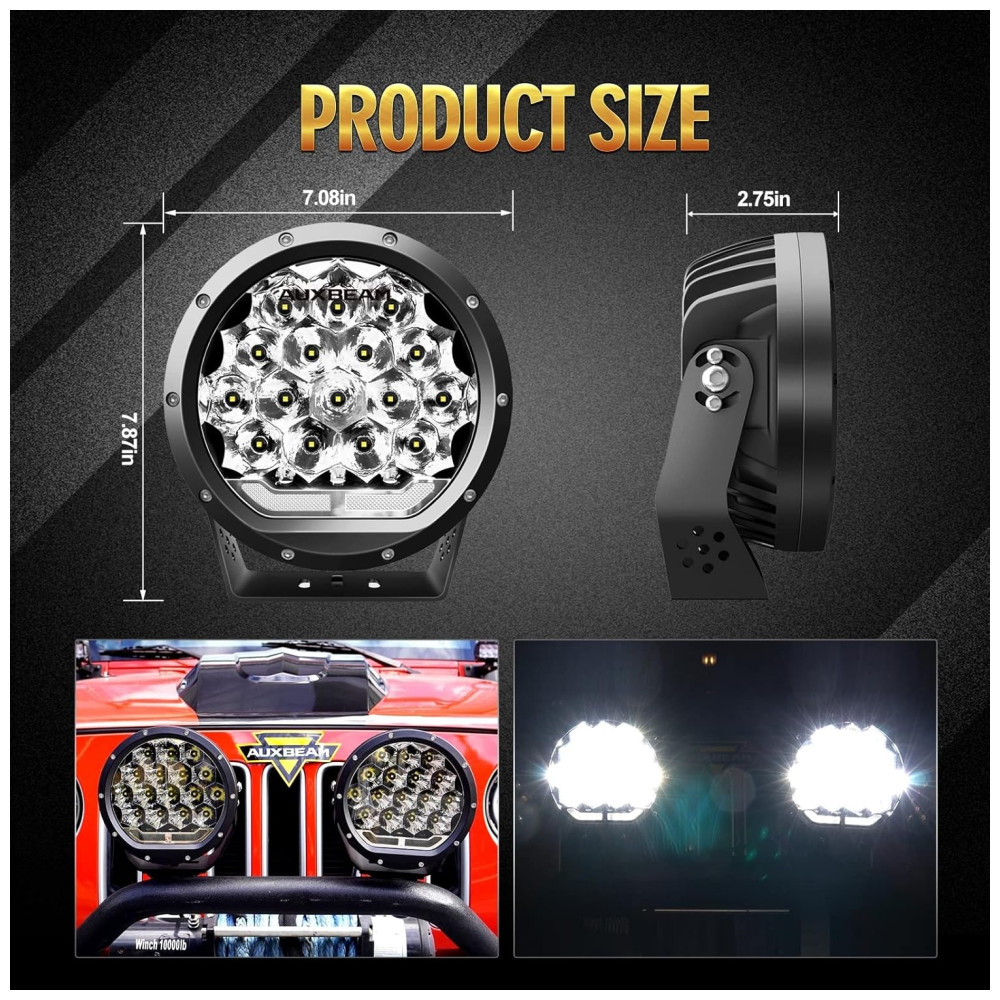 Super brilhante 7 em luzes led redondas projetadas com avançados chips de LED intensos de 21pcs 5W, cada luz de trabalho LED Auxbeam emite feixe de luz concentrado de 30 graus, iluminação superbrilhante 9400LM ajuda você a ver a estrada à frente com clareza, oferecendo uma direção mais segura e confortável experiência.
