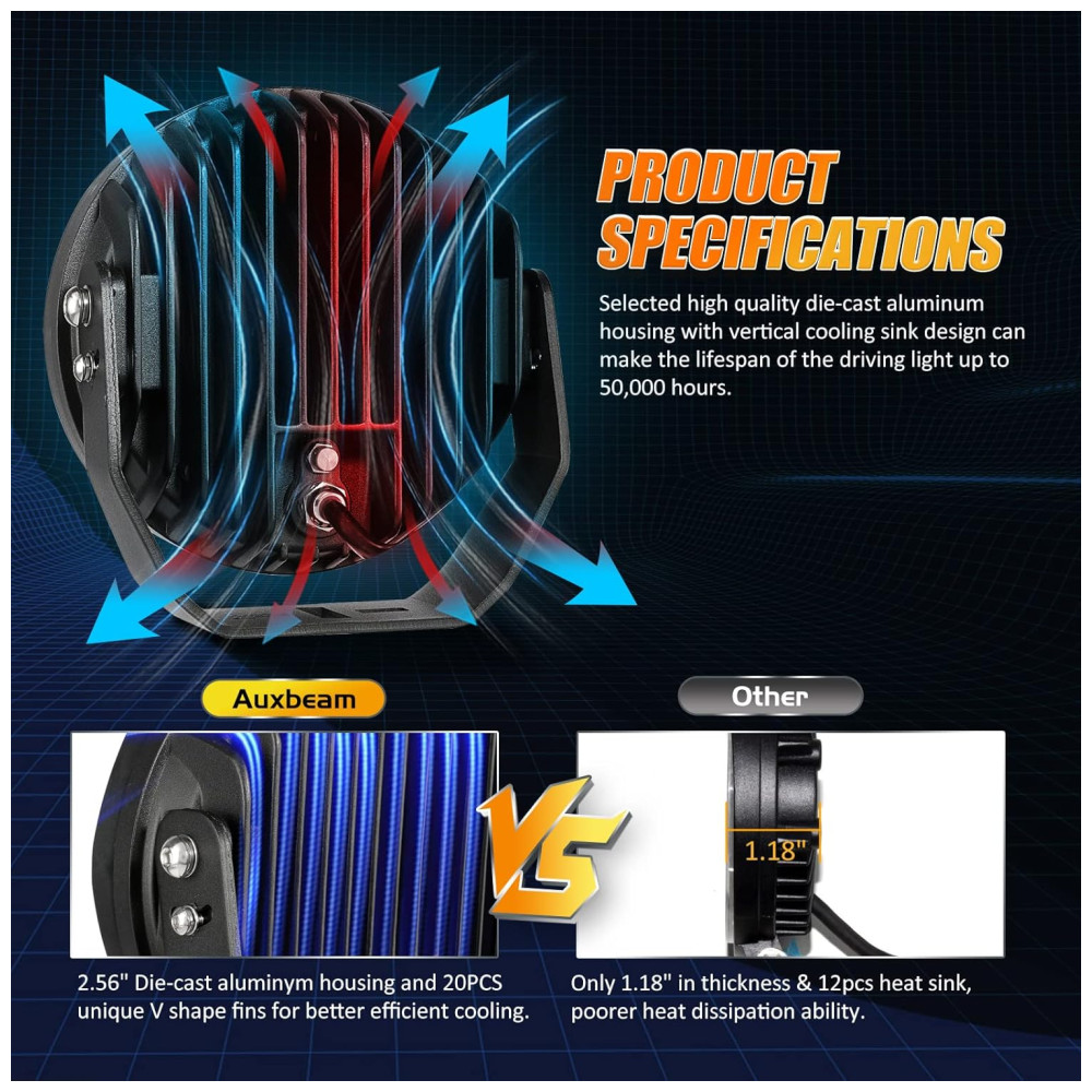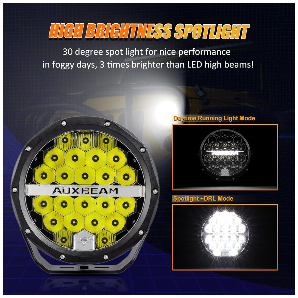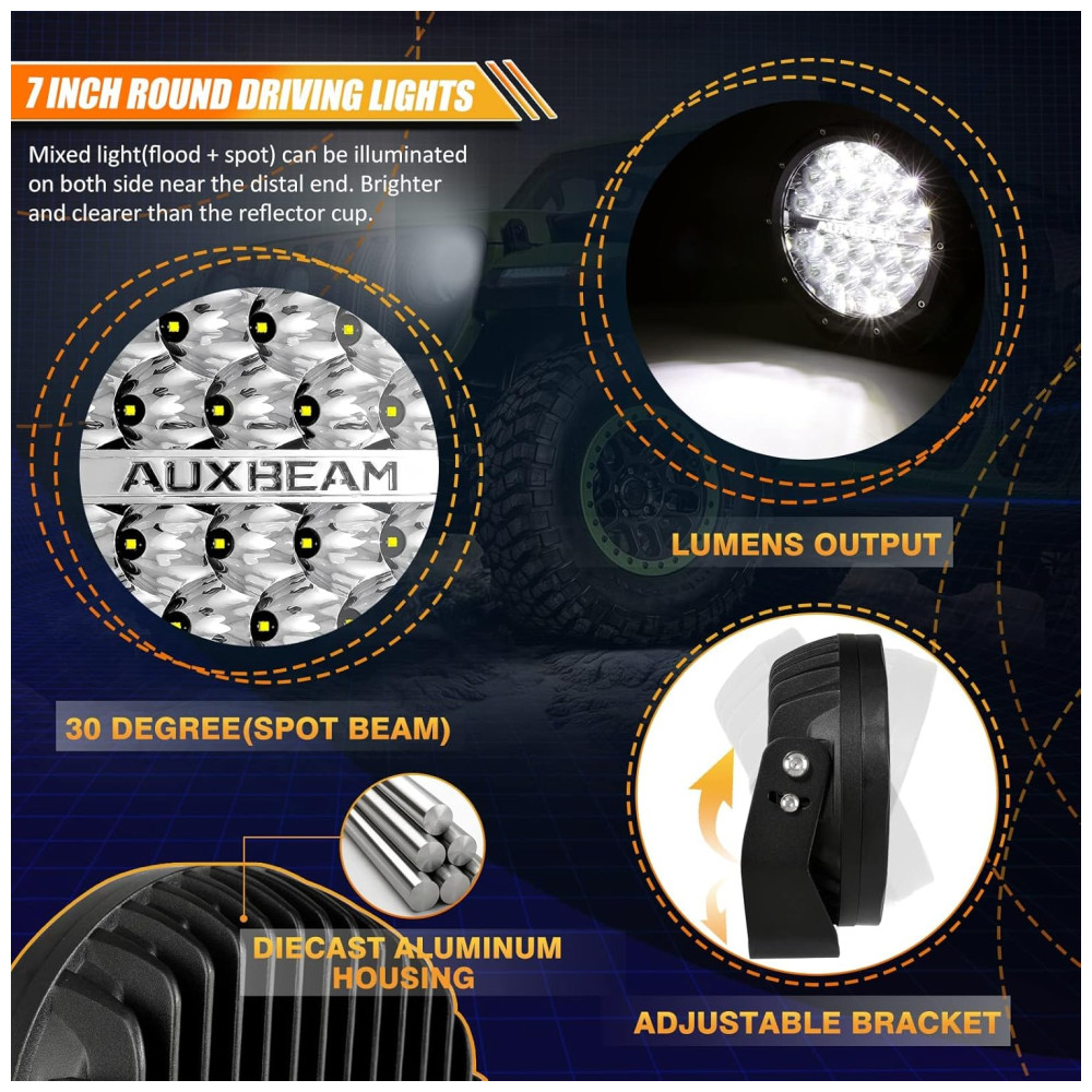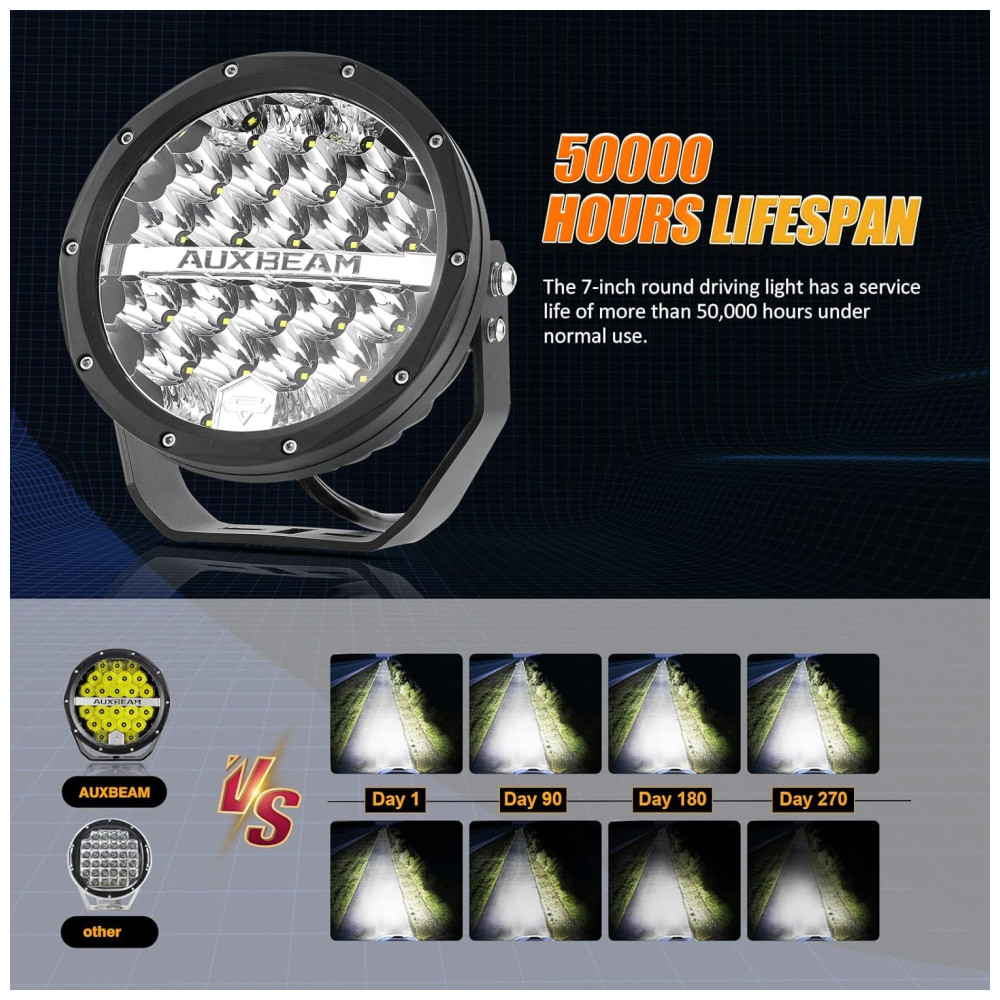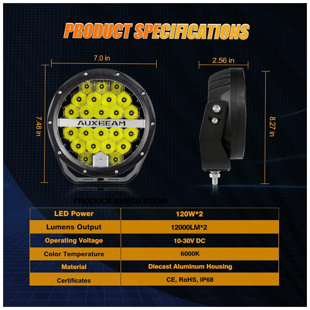 Mais brilhante e mais As luzes offroad led redondas de 17 centímetros usam avançados chips de LED intensos de 24 peças 5W. O LED de 120W em cada luz pode emitir luz pontual branca de 6000k com lúmens de 12000lm para dirigir o farol de neblina, o que é melhor para visibilidade em neblina, chuva, neve e pode projetar distâncias maiores.