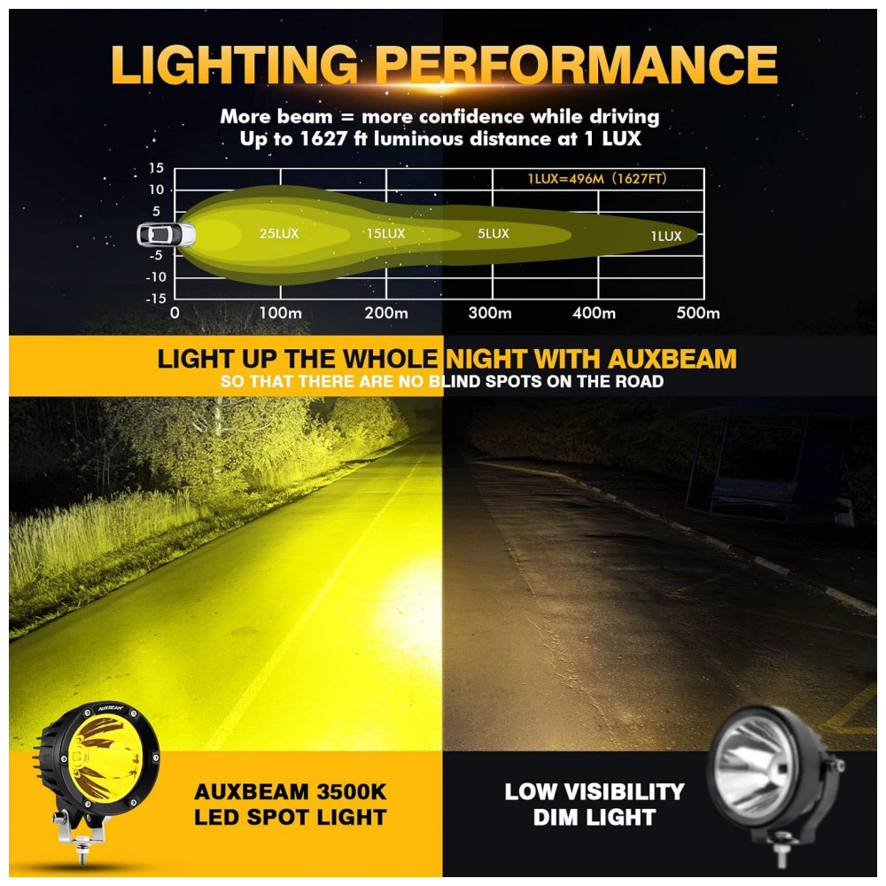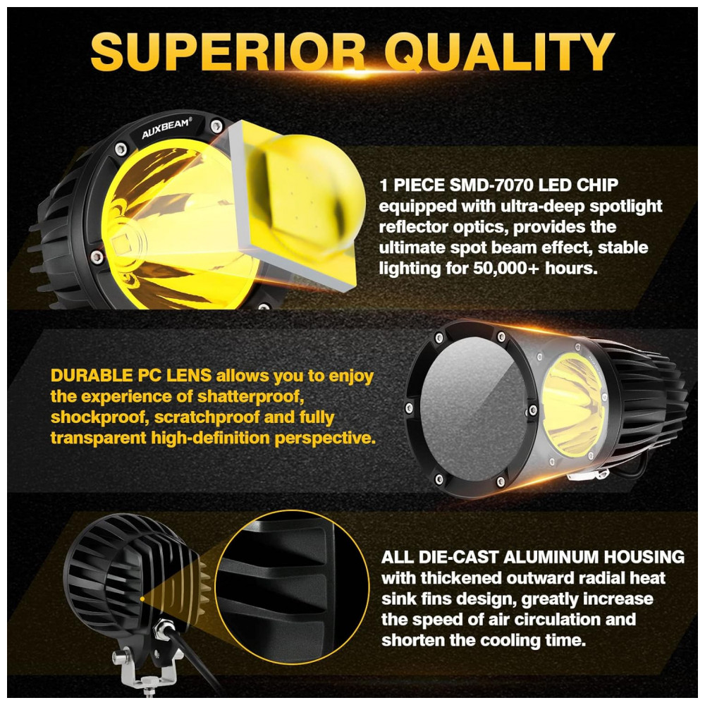 Intensidade luminosa Copo reflexivo de tamanho extra de orifício único com chips âmbar de LED modelo 7070 e lentes ópticas desenvolvidas mais recentemente, cujo fluxo luminoso e distância de irradiação válida aumentam 300, criam padrão SPOT BEAM e fazem com que as luzes offroad led redondas executem iluminação extremamente brilhante mesmo durante o dia.
