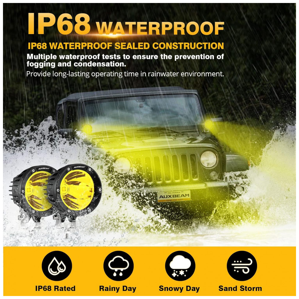 Padrões mais elevados Faróis de neblina âmbar de 10 centímetros possuem uma classificação IP68 à prova dágua, o que significa que é completamente contra poeira e partículas, submergiu a barra de luz redonda em 1,5 metros de água por mais de 2 horas e ainda funciona normalmente. Todos os pods de led são queimados e testados para impermeabilidade, poeira, ferrugem e choque antes de sair da fábrica.