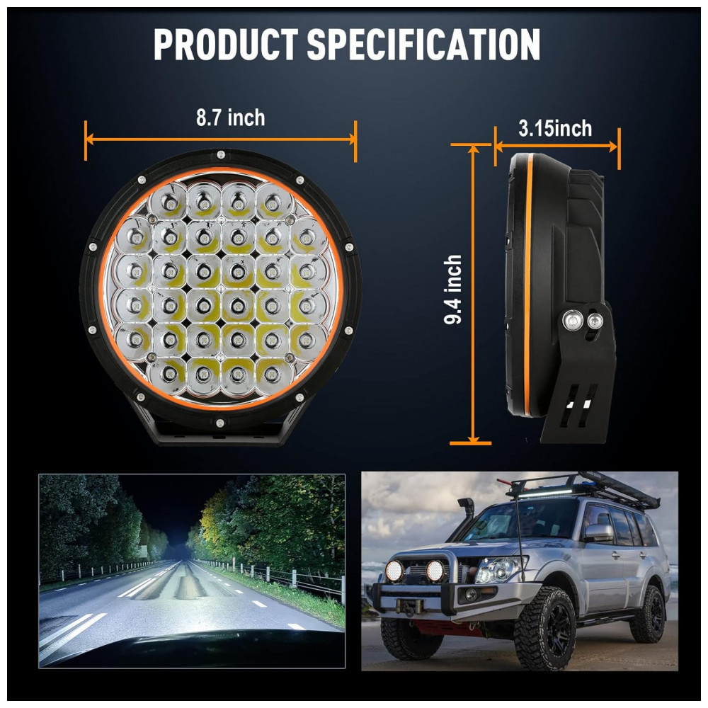 Efeito de iluminação eficiente Cada copo de luz é combinado com design de feixe de foco e inundação. O feixe pontual viaja bastante e tem uma boa largura. A luz offroad emite luz super brilhante. A luz led fora da estrada oferece uma visão segura na maioria dos climas ruins, como dias de chuva, dias de neblina e dias de neve, tornando a condução mais segura.