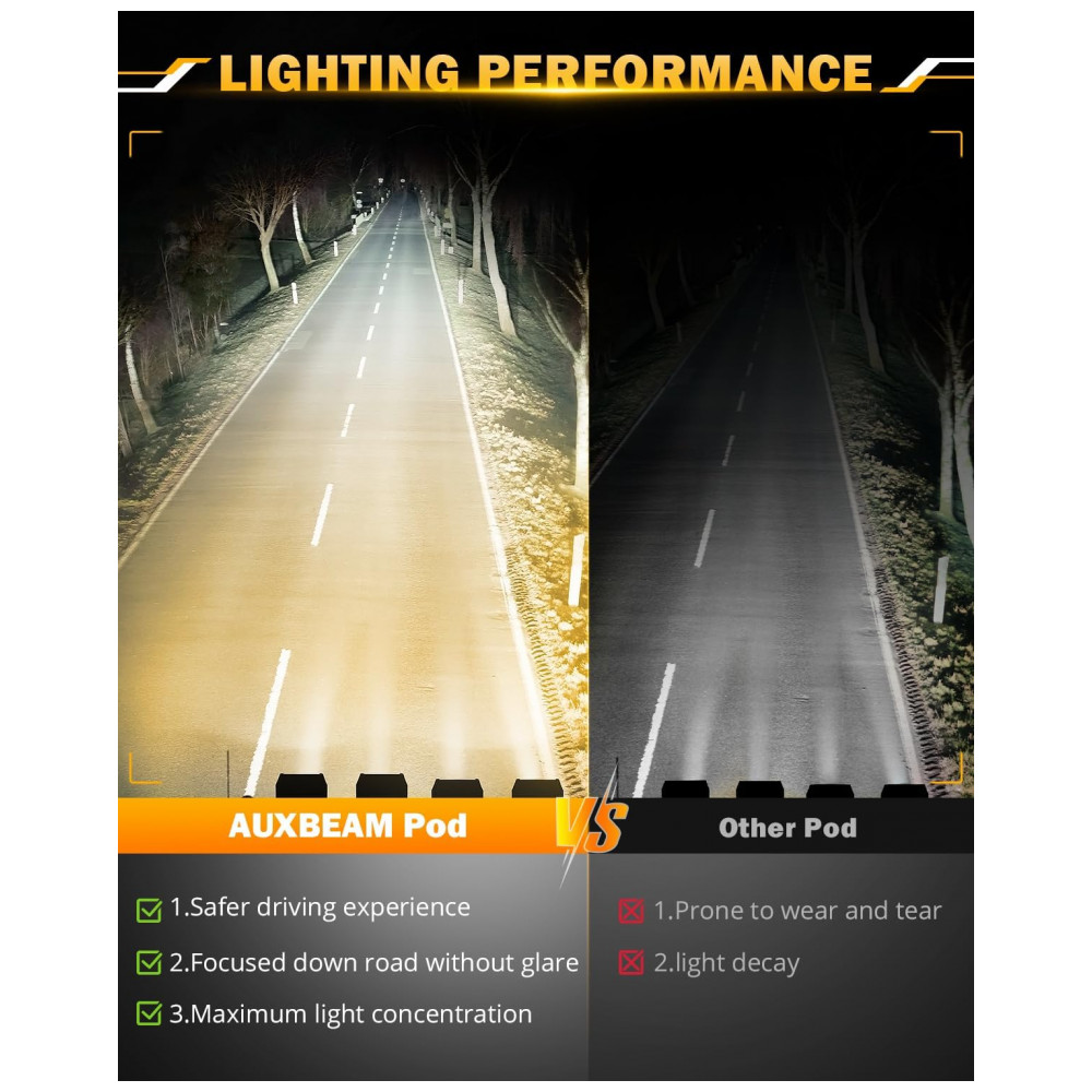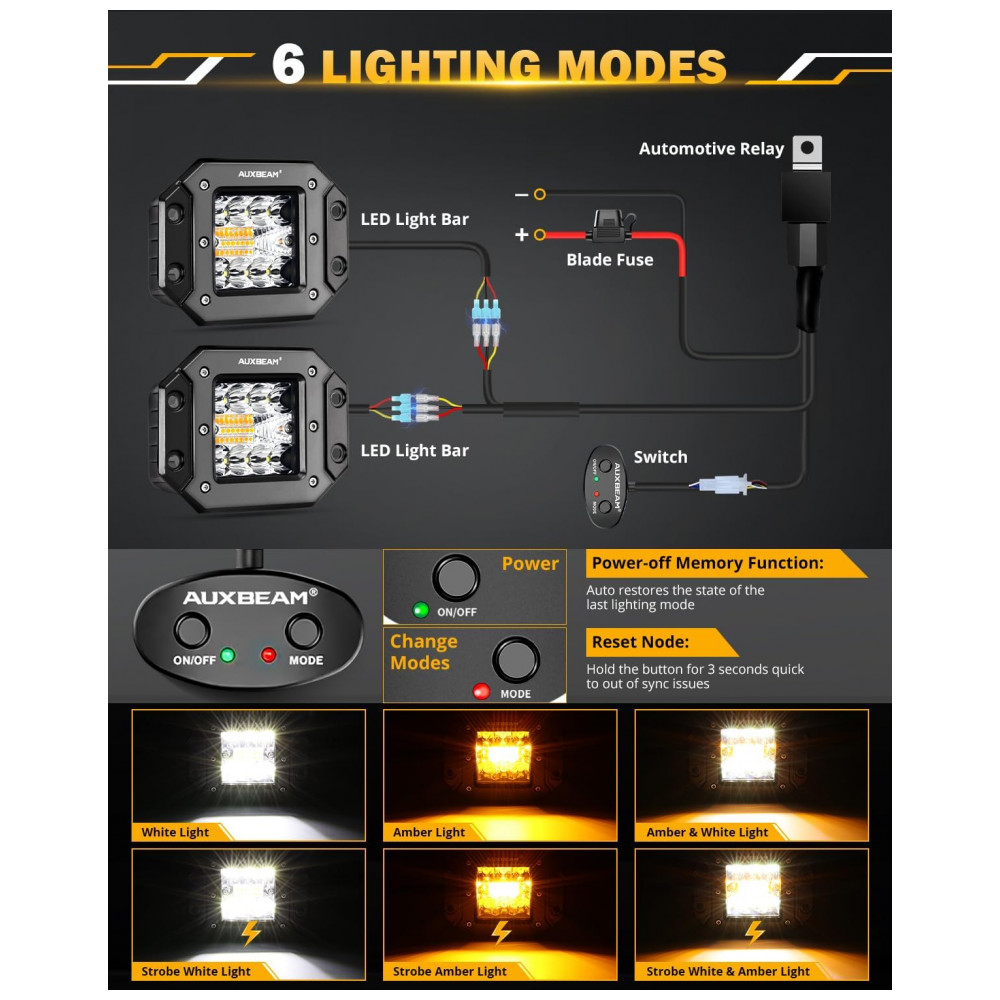 ATUALIZAR 6 MODOS DE ILUMINAÇÃO Auxbeam Barras de luz de 5 polegadas podem alternar entre branco, âmbar, branco e âmbar, branco, flash, âmbar, flash e branco e âmbar, estroboscópio alternando o modo de luz. Nosso design é muito adequado para luzes de advertência, faróis de nevoeiro, faróis de direção ou luzes de trabalho. 100 dos esforços foram dedicados a ajudar os motoristas a economizar tempo, economizar dinheiro e dirigir com segurança