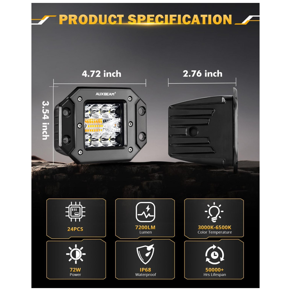 ULTRA ALTO BRILHO Este pod de LED de linha tripla de 72W é composto por lâmpadas de LED de 24 unidades, caixa de liga de alumínio fundido 6063, lente de PC transparente e resistente à corrosão. Pode fornecer feixe combinado de inundação pontual de 7200lm, para distância máxima à frente e iluminação periférica aprimorada ao longo das bordas da estrada
