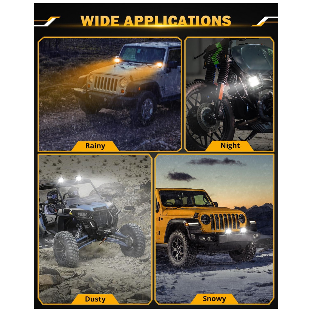 QUALIDADE PREMIUM Construído em IP68 à prova dágua, adota caixa de alumínio fundido à prova dágua atualizada e tecnologia de vedação avançada para suportar ambientes hostis e condições climáticas. Além disso, nossas luzes são integradas sem interferência eletromagnética EMC, resolvem o problema de interferência de rádio e cintilação