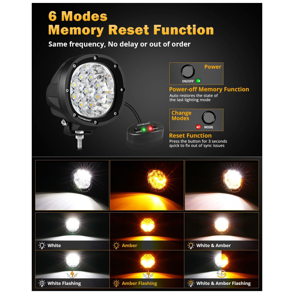 Recurso de 6 modos e 2 cores Desta vez, integramos funções de seis modos em luzes offroad de led redondo luz de condução branca luz de nevoeiro âmbar luz branca e âmbar luz intermitente branca luz intermitente âmbar luz estroboscópica branca e âmbar.