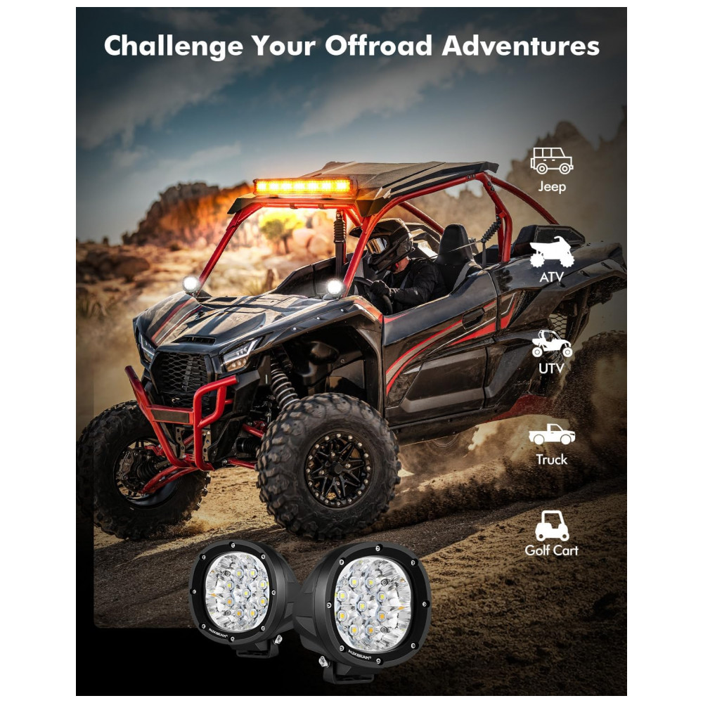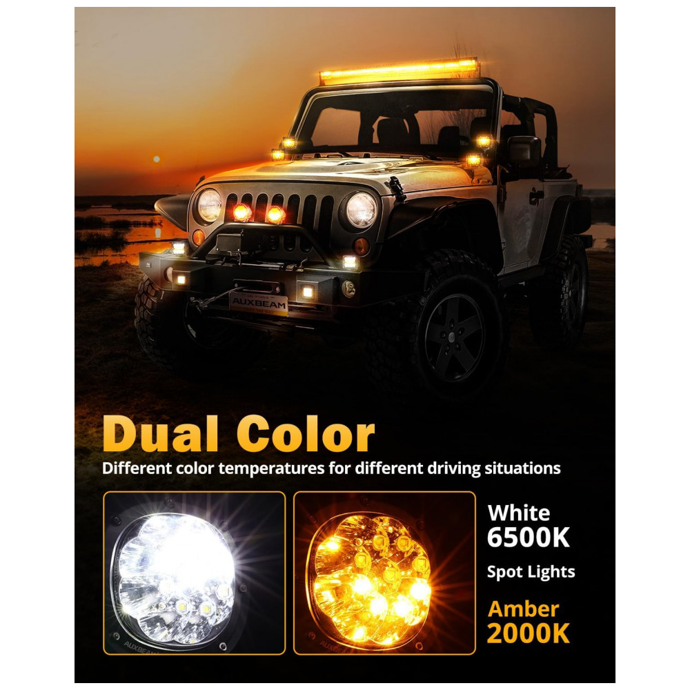 Funcionalidade atualizada mais recente A luz estroboscópica offroad TUDO EM UM pode atender às suas necessidades o feixe branco melhora sua visibilidade à noite, enquanto o feixe âmbar ajuda você a ver mais claramente em dias nublados ou chuvosos. A função strobe, piscando também pode fornecer um efeito de aviso SOS.