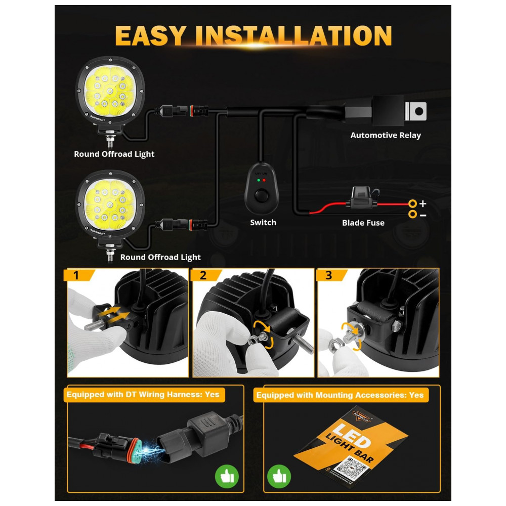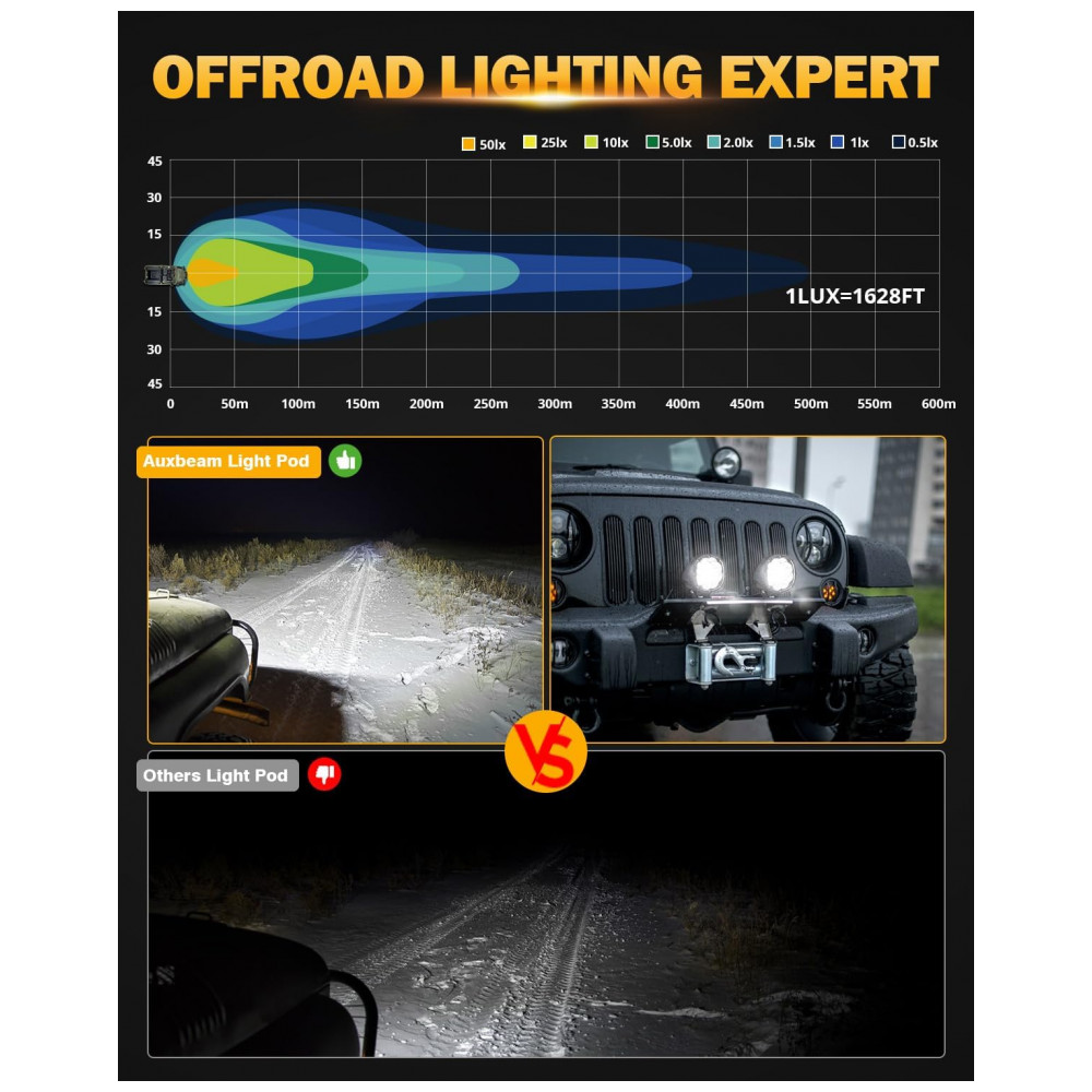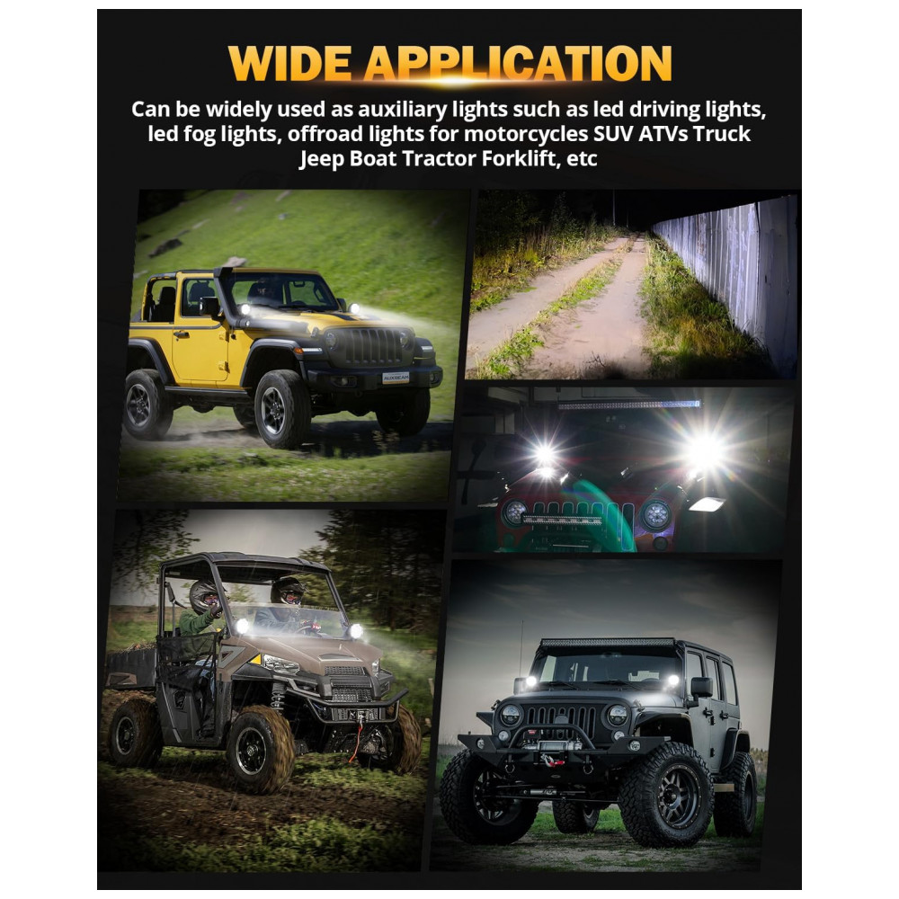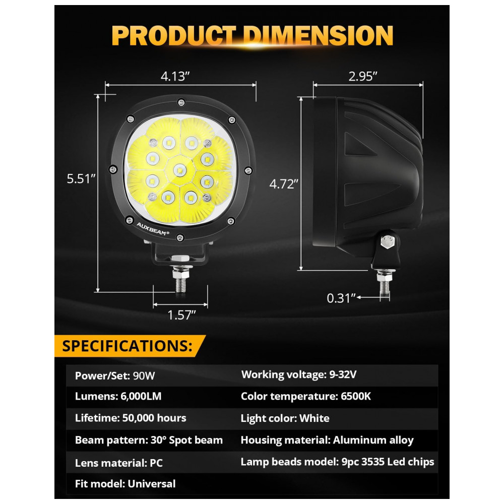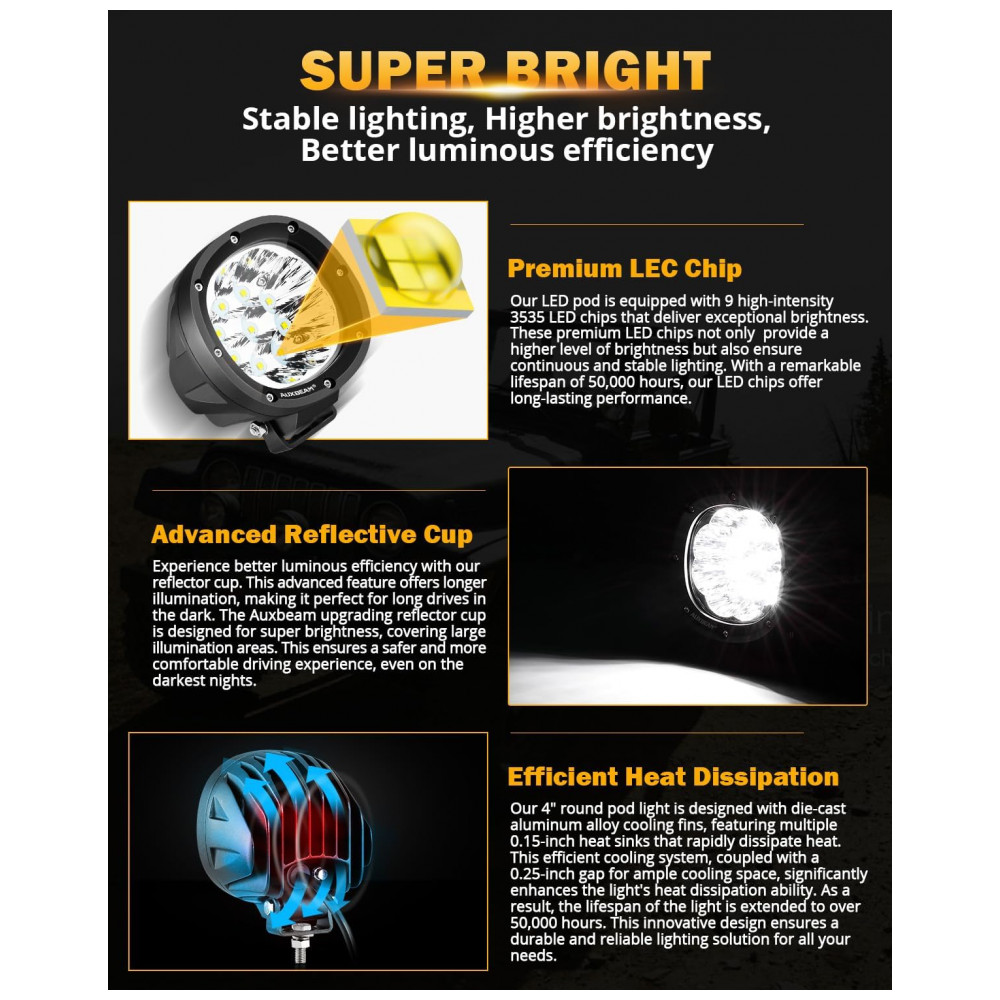 Super brilhante as luzes de direção redondas de 10 centímetros usam chips de led avançados com alto lúmen, alto brilho Cada luz redonda off road equipada com um chip led 9pcs 5w 3535, emite luz superbrilhante de 9000lm e fornece um feixe branco pontual de 6200K, muito mais brilhante do que o pod de luz padrão ou outro pod de luz.