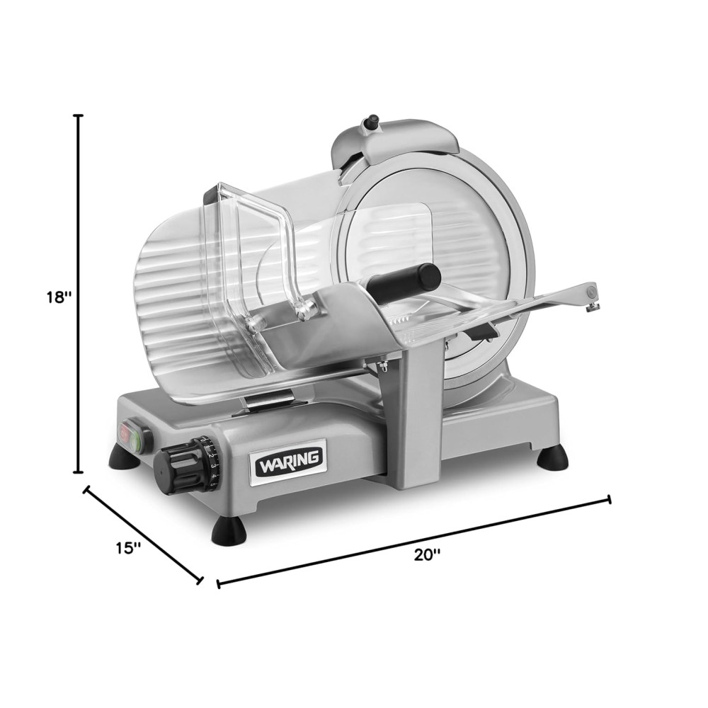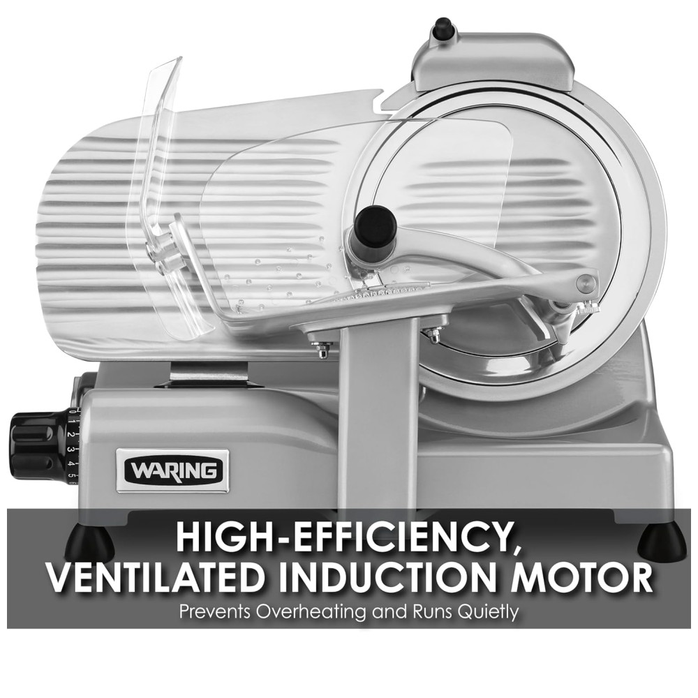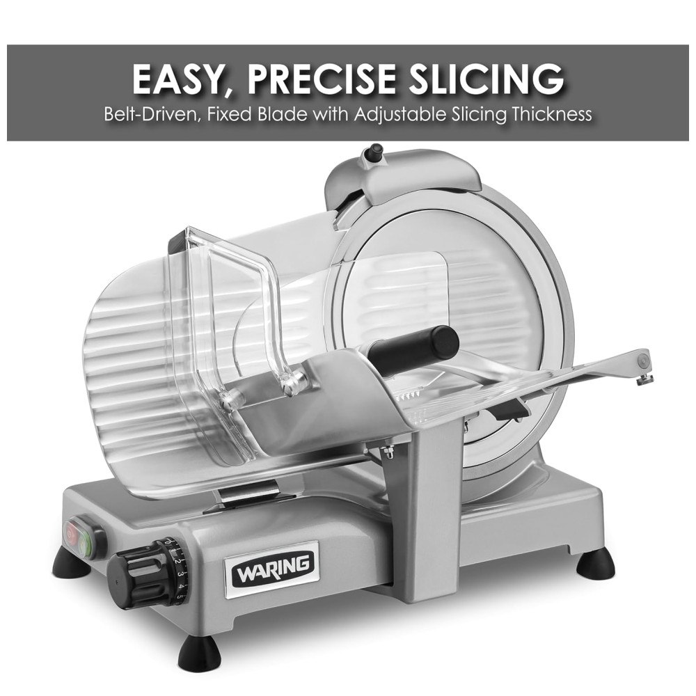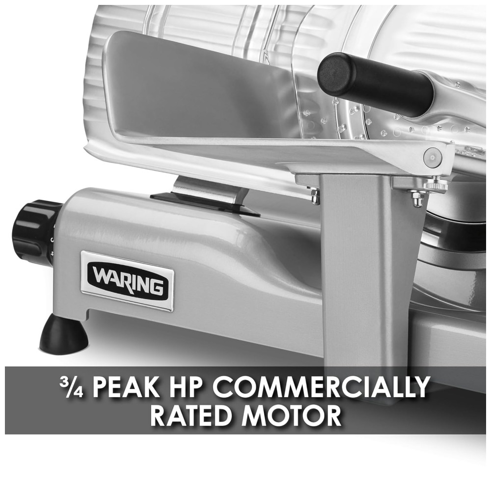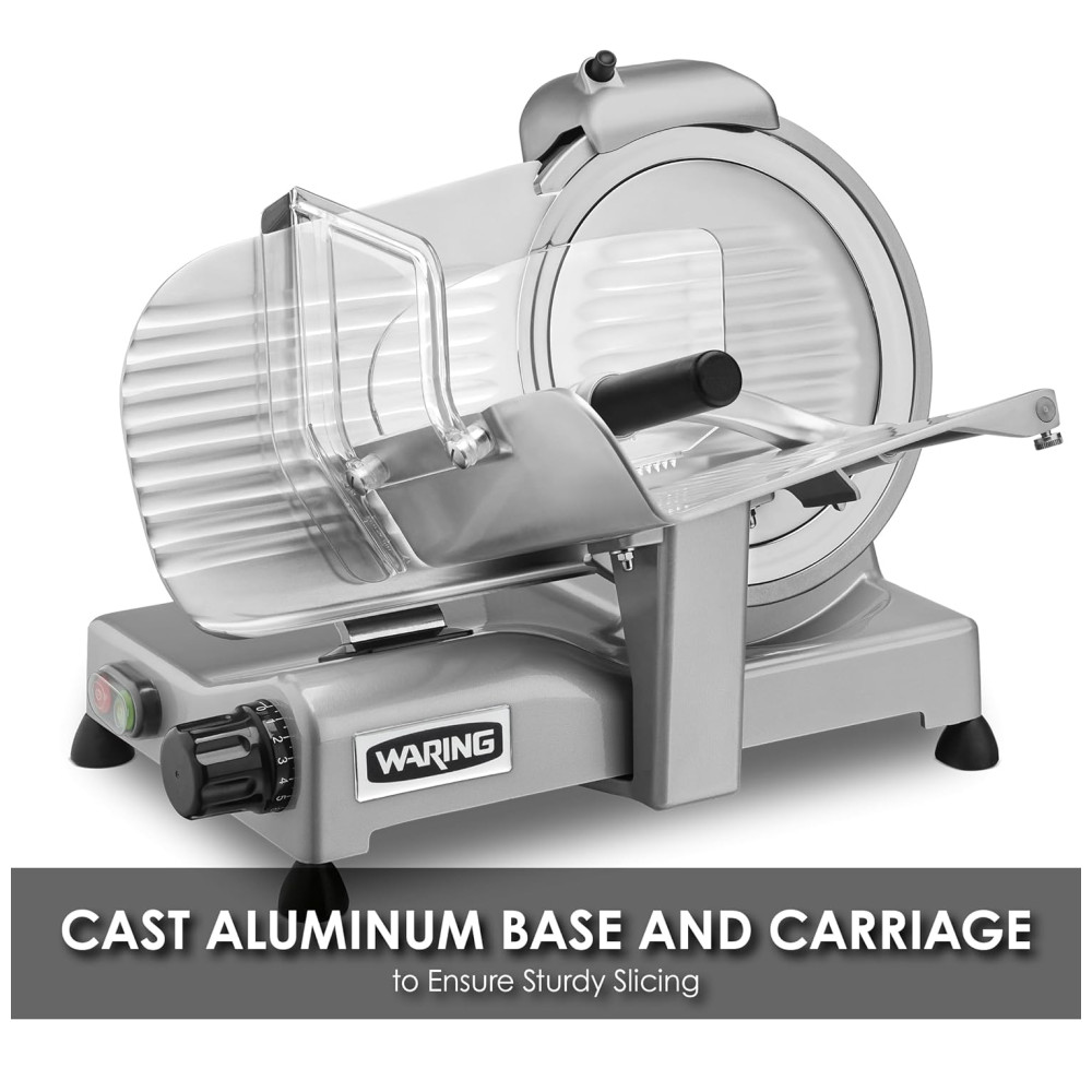 O cortador de alimentos Waring WCS250SV é acionado por correia e possui uma base e carro em alumínio fundido, que garantem alta eficiência de corte resistente.