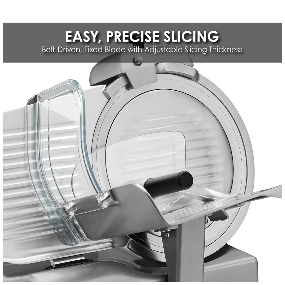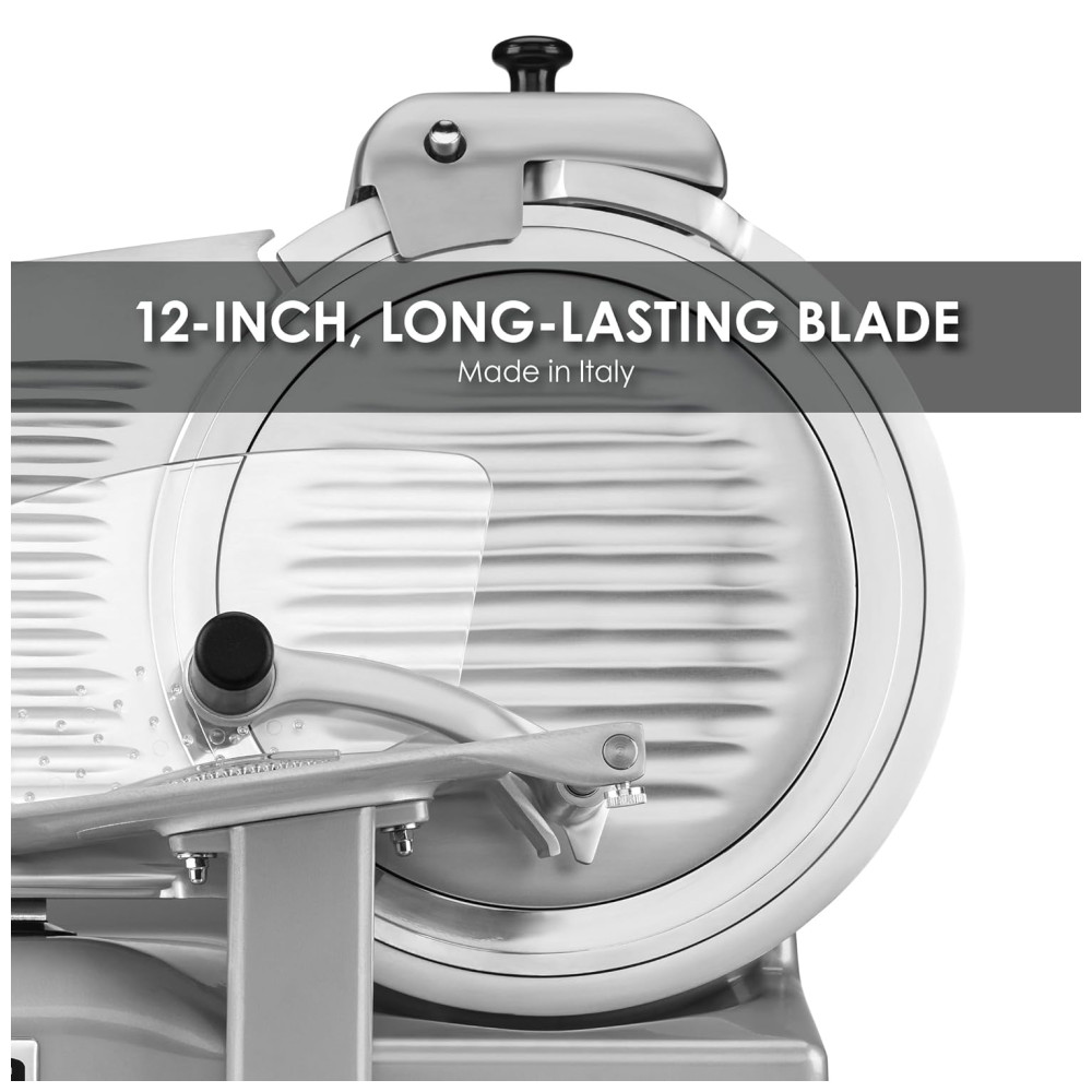 Sua lâmina extralarga de 30 cm é feita de cromo duro temperado, o que garante um corte preciso e duradouro. Além disso, a lâmina ajusta facilmente a espessura da fatia, permitindo cortar uma variedade de alimentos em fatias perfeitas.