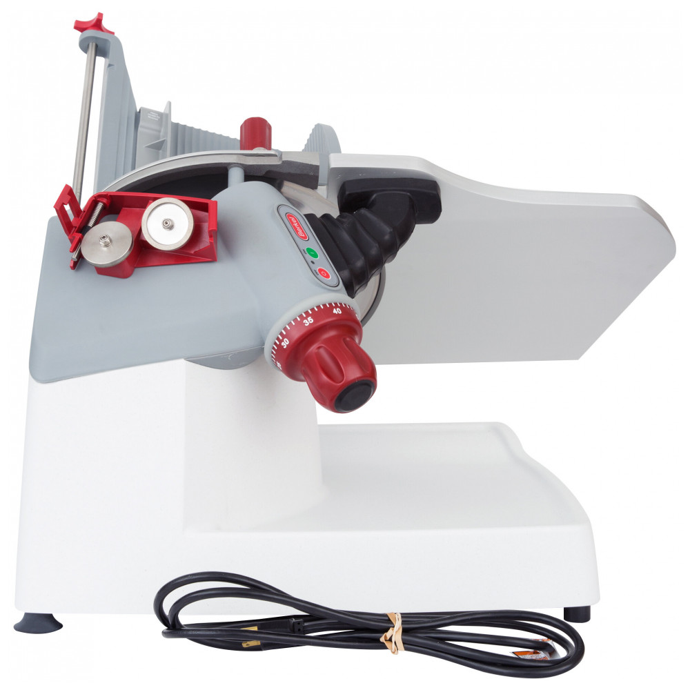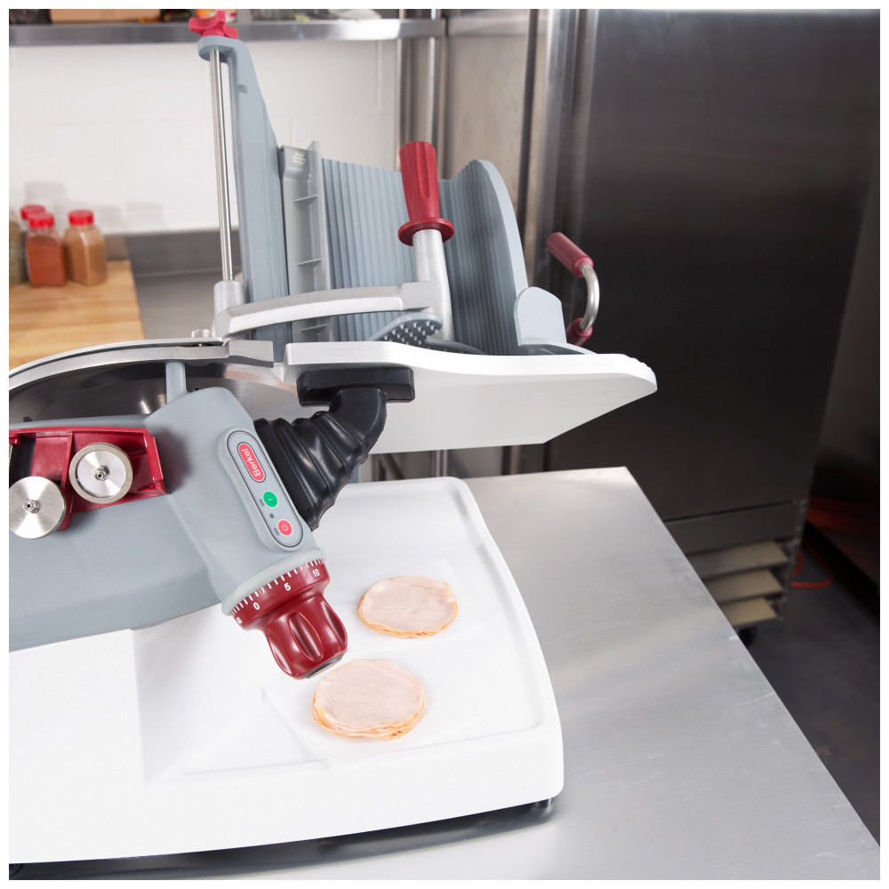 O fatiador de carne Berkel X13PLUS proporciona controle total com seu design manual de transporte, garantindo segurança com o dispositivo de trava da placa de calibre mecânico. Equipado com uma faca de aço inoxidável forjado de 33,02 cm, é ideal para aplicações que exigem fatiamento constante de carnes e queijos. Com motor de 1/2 hp, é perfeito para delis, mercados e locais com alto volume de fatiamento. Sua bandeja inclinada a 45 graus utiliza a gravidade para manter o produto contra a faca, reduzindo a necessidade de pressão e garantindo consistência. Possui afiador removível e submersível, ajuste de espessura e base de polímero para facilitar a limpeza.