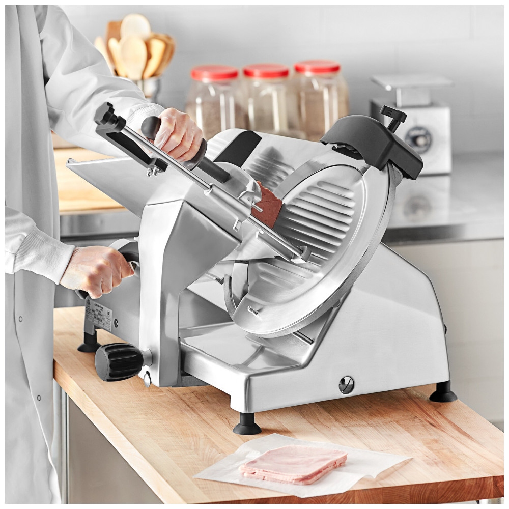 Desfrute de cortes precisos e eficientes com o Fatiador de Carne Manual Hobart EDGE14 14. Este modelo é a solução perfeita para todas as suas necessidades de cortes médios! Feito com alumínio anodizado durável, é fácil de limpar e manter, proporcionando eficiência máxima. Com bandeja de produto extra grande e extensão da haste deslizante, é possível cortar até mesmo os maiores assados de carne de forma rápida. Com capacidade para alimentos de até 27,94 cm de largura. A lâmina de aço carbono cromado de 14 polegadas oferece cortes precisos em diferentes espessuras. O afiador de cerâmica montado na parte superior mantém a lâmina sempre afiada. Este fatiador opera silenciosamente, graças ao sistema de transmissão por correia em V. O motor de 1/2 hp garante potência para lidar com diversos tipos de alimentos. Além disso, conta com botão de partida e parada selado, facilitando o uso. Com diversas medidas de segurança, como proteção para os dedos e trava de segurança, este fatiador garante um manuseio seguro durante o uso e a limpeza.