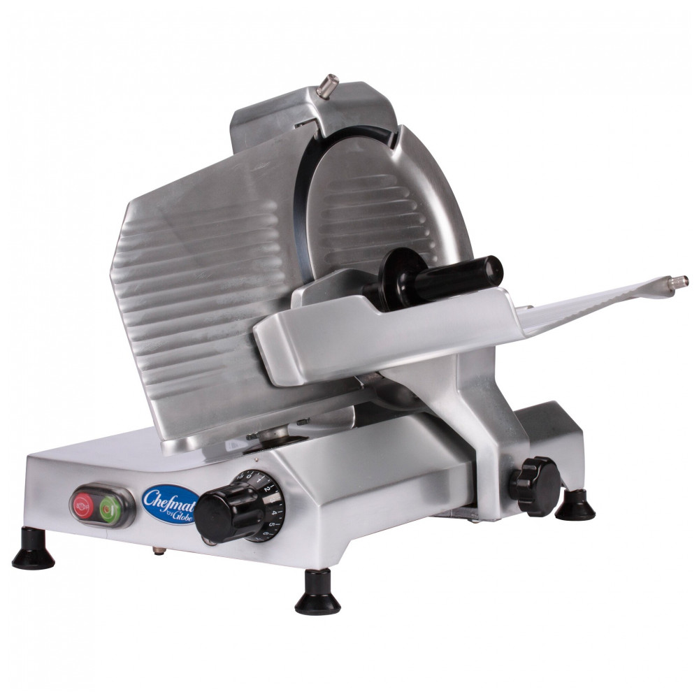 Construído em alumínio anodizado e acionado por correia, o Fatiador Globe Chefmate C10 é a adição perfeita para pequenas operações como cafeterias. Com capacidade de fatiar, este fatiador compacto é ideal para locais com pouco espaço no balcão. Seu motor de 1/4 hp e lâmina de 25,40 cm permitem cortar aproximadamente 30 minutos de carne e legumes por dia. O design compacto economiza espaço e a empunhadura ergonômica proporciona estabilidade ao fatiar. Com controle de espessura de 15 opções, de fatias finas a cortes , este fatiador oferece precisão e segurança durante o uso.