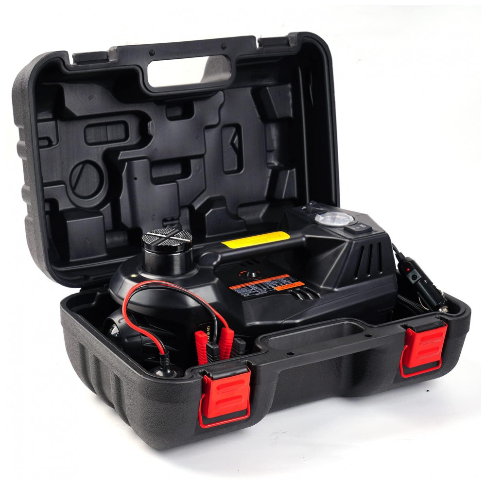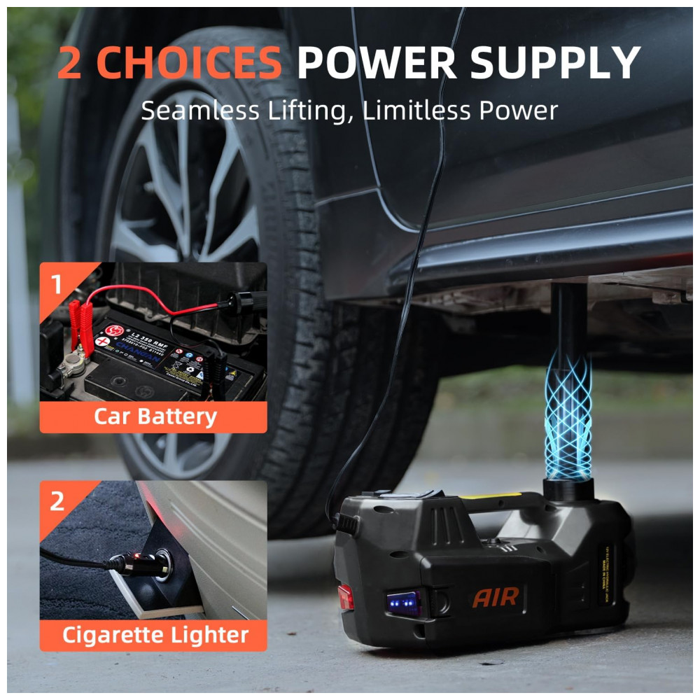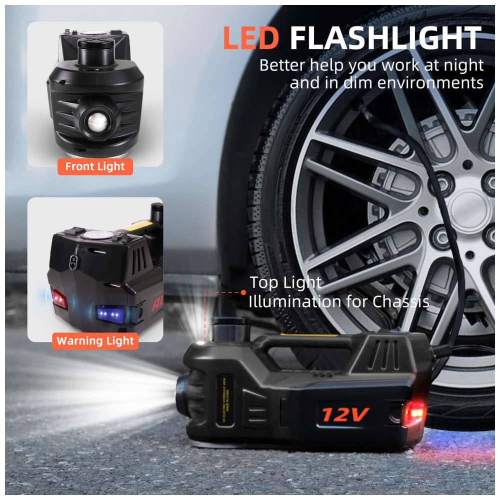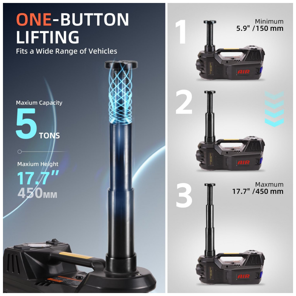 FEITO EM DOIS MINUTOS Este macaco elétrico para carro é capaz de levantar um sedan ou SUV que pesa no máximo 11000 libras em dois minutos e também pode servir como uma bomba inflável capaz de gerar uma pressão de 150 psi. O tanque hidráulico é totalmente fechado permitindo que você use o macaco em qualquer ângulo sem vazar óleo.